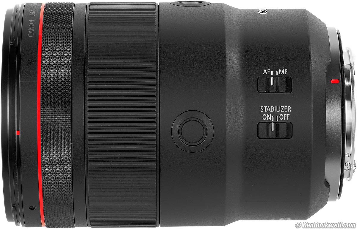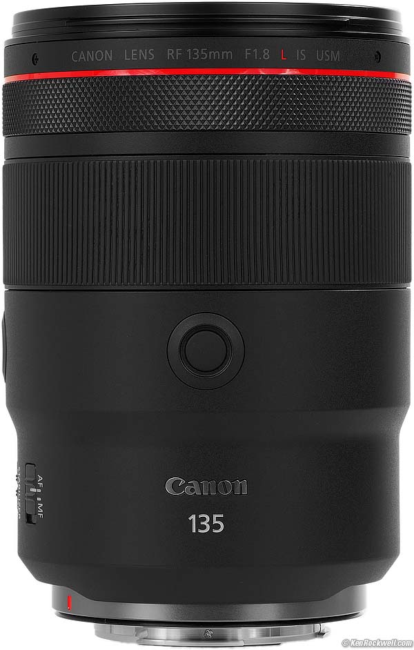 Other than being a handful, ergonomics are great. The additional front control ring is a feature common to many Canon RF lenses. You can set it in your camera to be Exposure Compensation, Aperture, ISO or other things. You can pay Canon service to remove the clicks from the front control ring. I prefer them with the clicks as shipped. It also has two programmable Lens Fn buttons, which default as AF Lock. You can program these in your camera to do other things. There are two buttons, one for vertical and the other for horizontal shots. They each do the same thing; you can't program to do different things. It has both AF/MF and STABILIZER switches: Canon RF 135mm f/1.8 L IS USM. bigger.