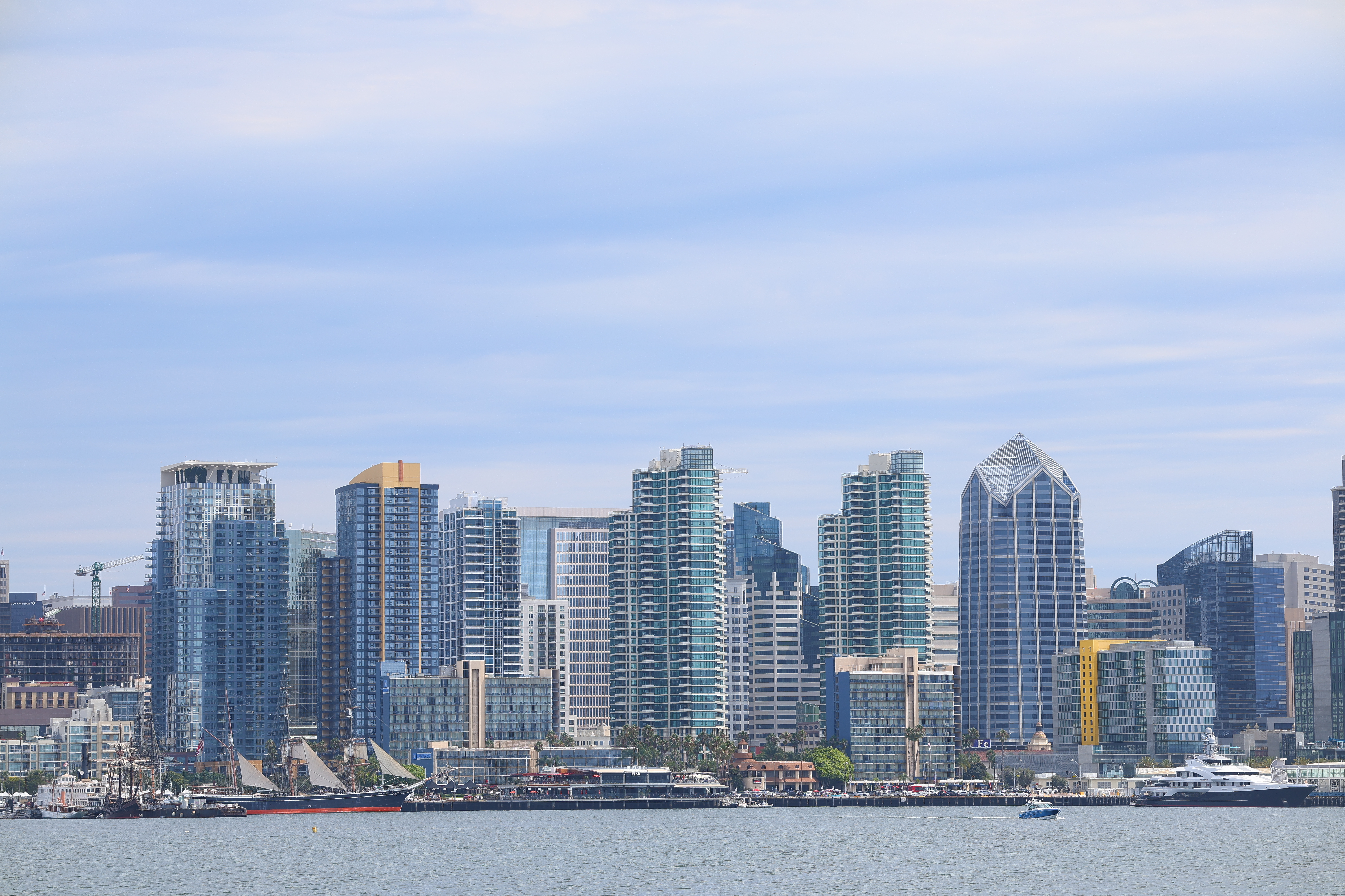 Sample Images topSample Images Intro New Good Bad Missing Specifications Performance Compared More samples throughout this review at Bokeh, Falloff, Macro, Spherochromatism and Sunstars. These are just snapshots; my real work is in my Gallery. These are all shot hand-held as NORMAL (▟ stairstep icon) JPGs; no tripods, FINE (quarter circle) JPGs or RAW CR3 files were used or needed. Downtown San Diego and the Embarcadero as seen from Harbor Island's Coasterra on a Gray Day, 1:17 PM, Sunday, 10 September 2023. Canon EOS R8, Standard Picture Style with sharpening set to 7,1,1 and Saturation to +4, RF 135mm f/1.8 L IS USM at f/5 at 1/500 at ISO 50, +0.3 stops exposure compensation (LV 14.6), Perfectly Clear (now sold as Radiant Photo). bigger or camera-original 24 MP © 10 MB JPG FINE (quarter-circle icon) file.