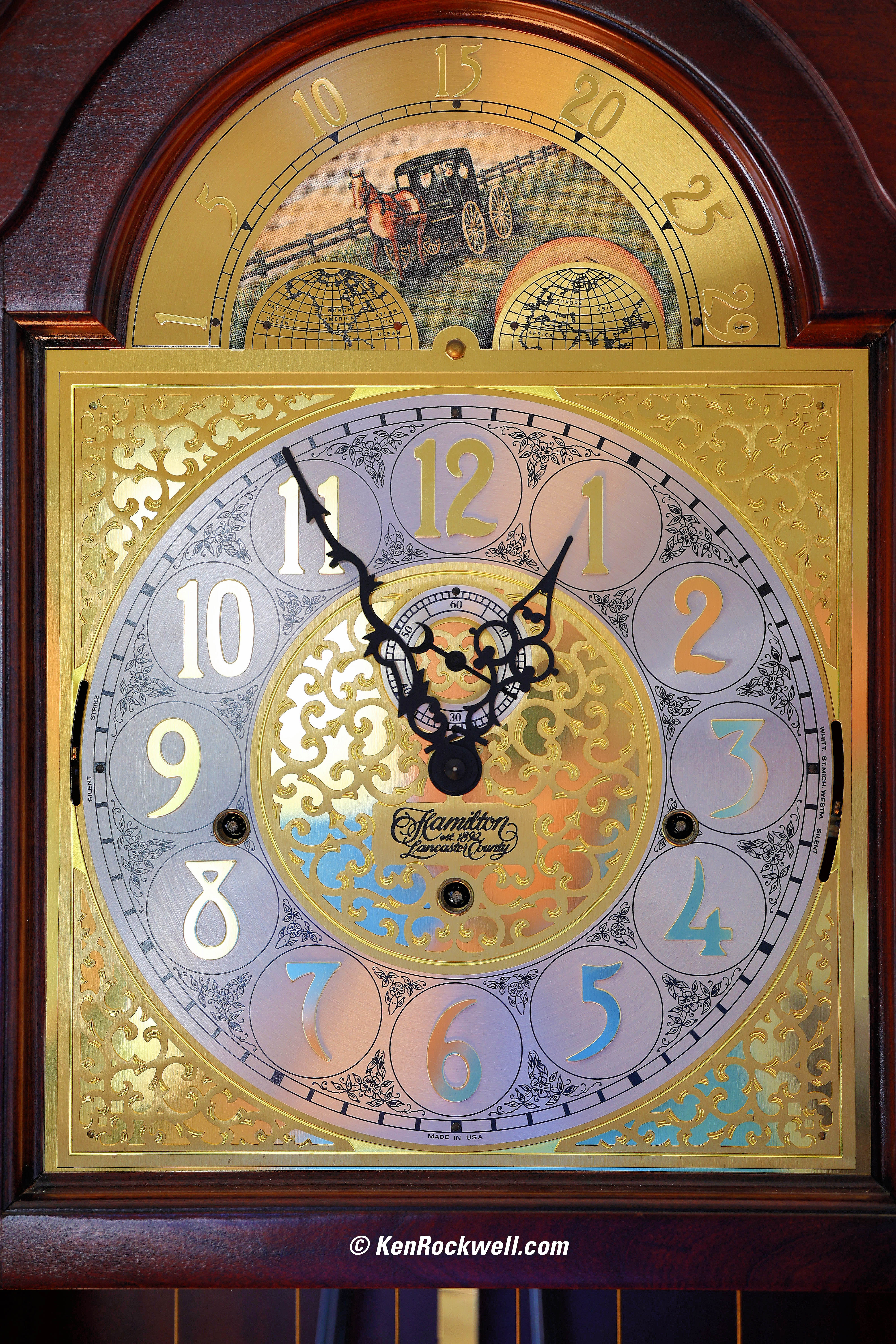 Hamilton Lancaster Grandfather Clock Face, 12:55 PM, Wednesday, 13 September 2023. Canon EOS R8, Standard Picture Style with sharpening set to 7,1,1 and Saturation to +4, RF 135mm f/1.8 L IS USM at f/2.8 hand held at 1/160 at Auto ISO 100 (LV 10.4), Perfectly Clear (now sold as Radiant Photo). bigger or full resolution 24 MP © 5 MB JPG file (file size reduced from camera original JPG NORMAL file.) This is shot with distortion correction OFF and is an extreme test, with straight lines parallel to the edge. All the distortion goes away with Distortion Correction ON. It's ultra sharp even hand-held here for a quick shot of my clock. Even shot off the cuff focus is dead-on and you can see the halftone dots in the moon phase artwork. In fact, I'd never seen the artist's signature on that artwork in person; I only first saw it here in this photo!