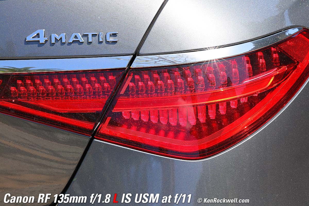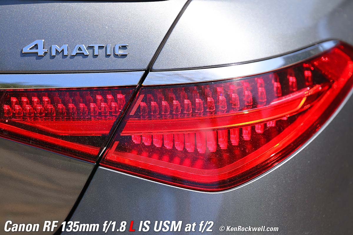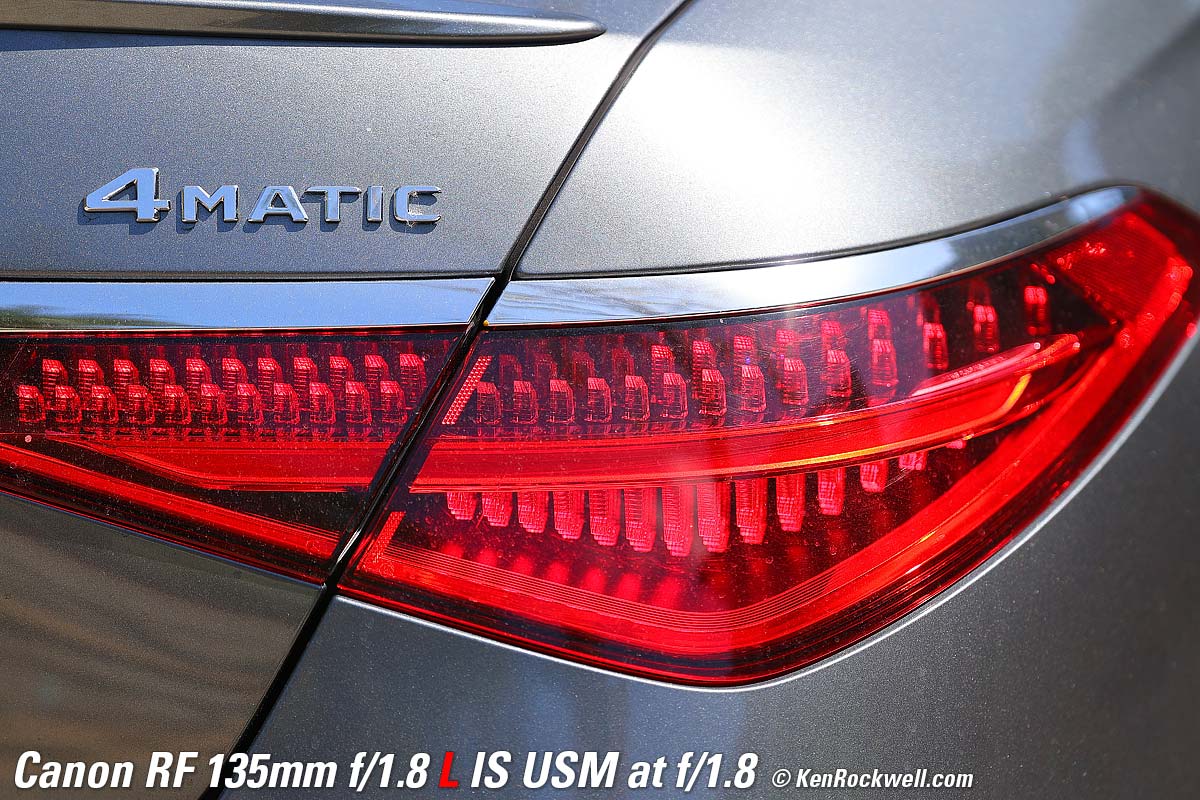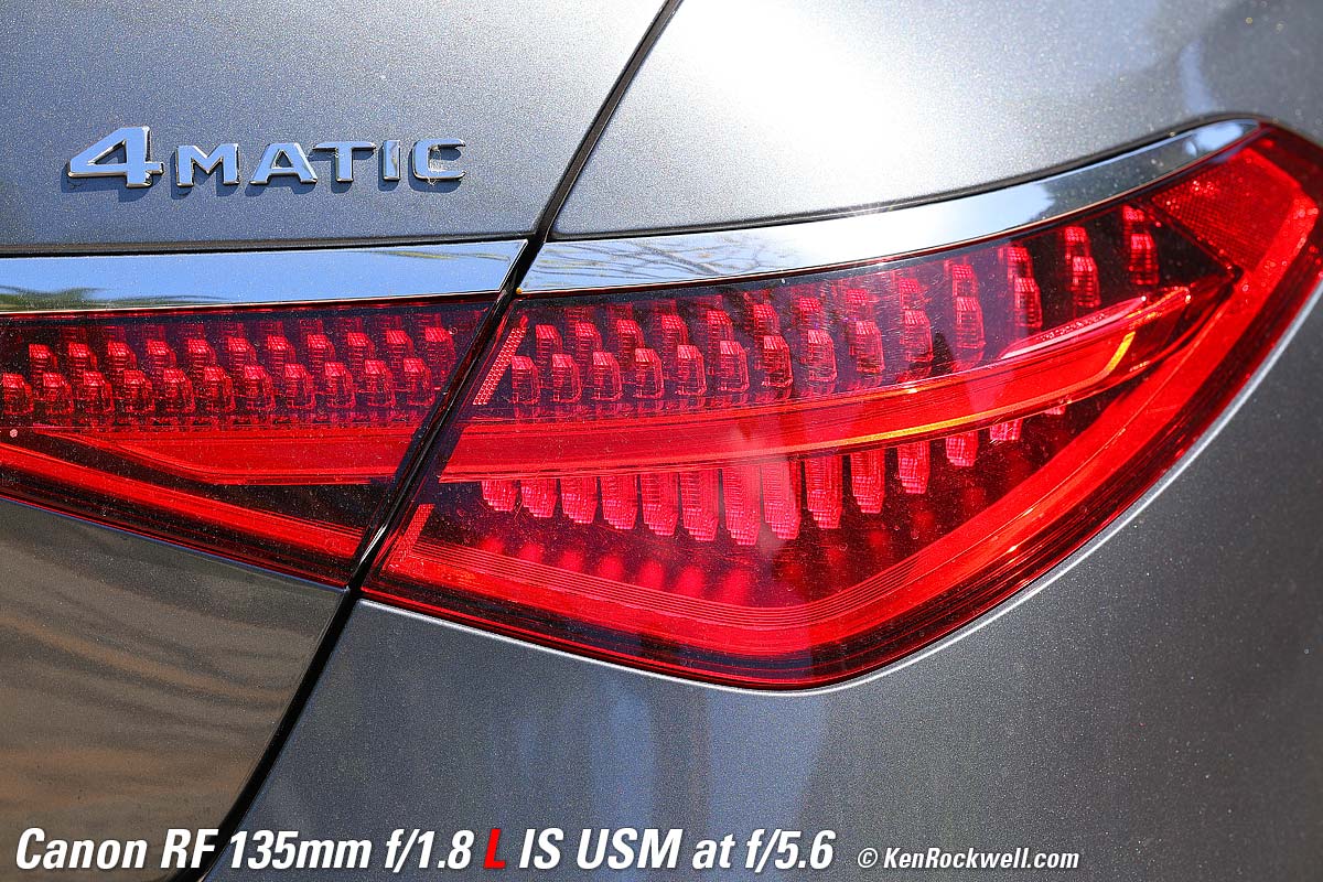 Mercedes S580, 6:58 PM, Monday, 18 September 2023. Canon EOS R8, Standard Picture Style with sharpening set to 7,1,1 and Saturation to +4, RF 135mm f/1.8 L IS USM wide-open at f/1.8 hand held at 1/160 at Auto ISO 1,250 (LV 5.4), Perfectly Clear (now sold as Radiant Photo). bigger or camera-original 24 MP © 4.3 MB JPG NORMAL (▟ stairstep icon) file. What makes this lens stand out isn't just the soft background bokeh. Skilled eyes will appreciate the lack of spherochromatism, which often leads to green color fringes on the out-of-focus chrome highlights towards the rear of the car. It's unusual and good that the out-of-focus highlights remain neutral and natural, rather than tinged with green. It's also great that Image Stabilization makes it trivial to hand-hold at dusk without any worries about sharpness. If I was paying attention I would have shot at 1/50 and a lower ISO for even better results, but this, like much of my work, is real-world grab shots. Introduction topSample Images Intro New Good Bad Missing Specifications Performance Compared
