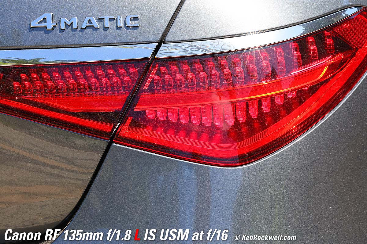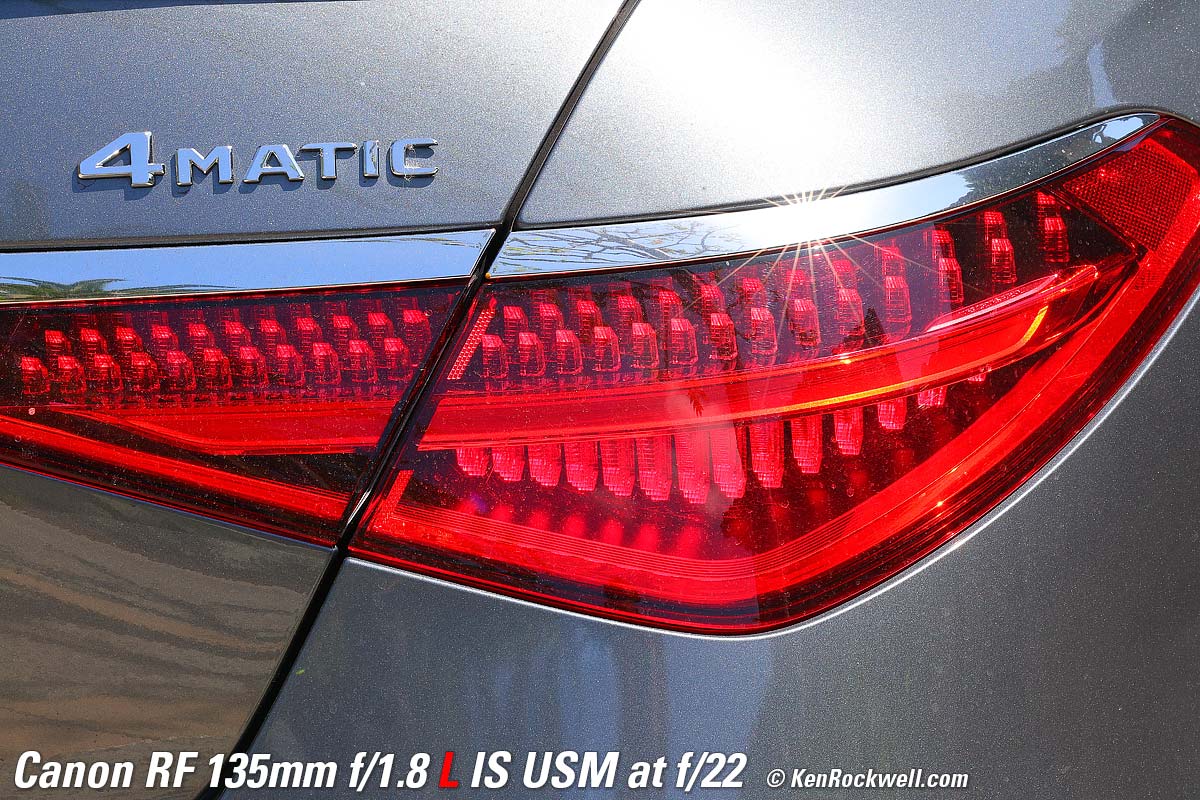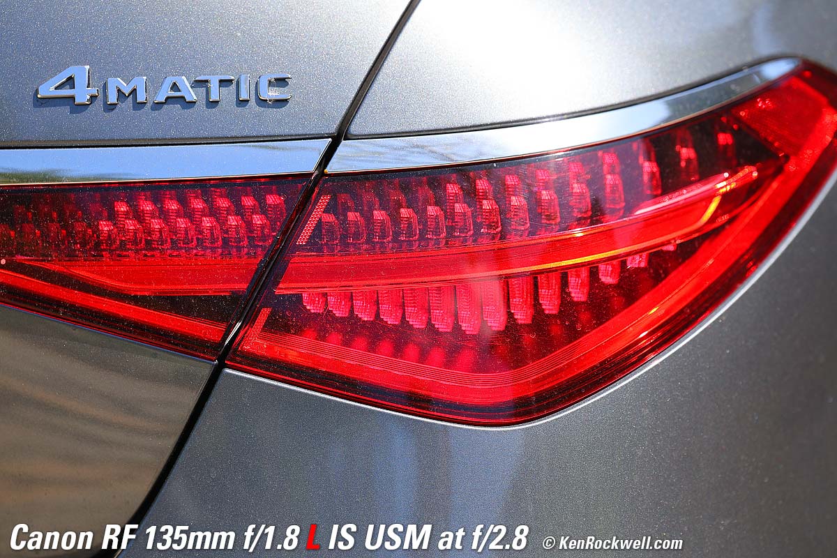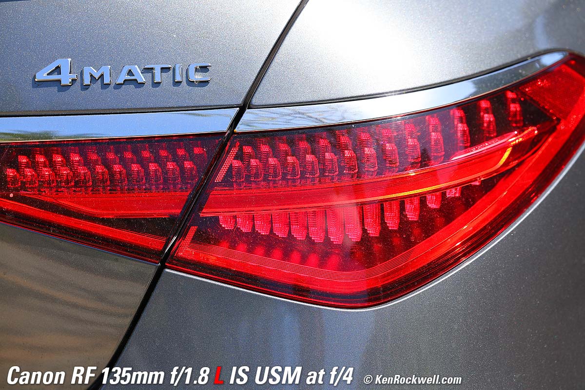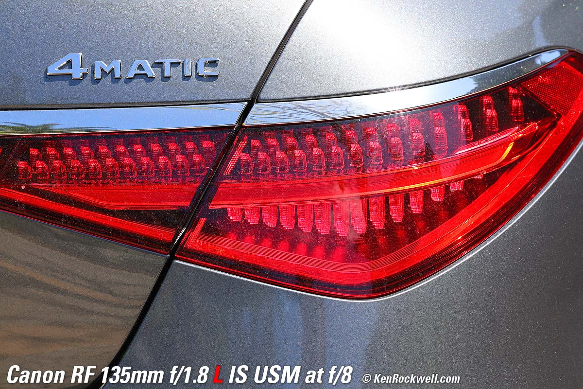 Mercedes S580, 6:58 PM, Monday, 18 September 2023. Canon EOS R8, Standard Picture Style with sharpening set to 7,1,1 and Saturation to +4, RF 135mm f/1.8 L IS USM wide-open at f/1.8 hand held at 1/160 at Auto ISO 1,250 (LV 5.4), Perfectly Clear (now sold as Radiant Photo). bigger or camera-original 24 MP © 4.3 MB JPG NORMAL (▟ stairstep icon) file. What makes this lens stand out isn't just the soft background bokeh. Skilled eyes will appreciate the lack of spherochromatism, which often leads to green color fringes on the out-of-focus chrome highlights towards the rear of the car. It's unusual and good that the out-of-focus highlights remain neutral and natural, rather than tinged with green. It's also great that Image Stabilization makes it trivial to hand-hold at dusk without any worries about sharpness. If I was paying attention I would have shot at 1/50 and a lower ISO for even better results, but this, like much of my work, is real-world grab shots. Introduction topSample Images Intro New Good Bad Missing Specifications Performance Compared