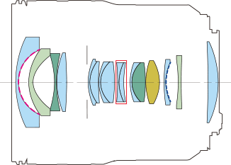 Optics specifications topCanon 14-35/4 internal optical construction. Glass-Moulded Aspherical, UD and Aspherical UD elements. IS section. - - - : Sub-wavelength Structure Coating (SWC). - - -: Air Sphere Coating (ASC). 16 elements in 12 groups. 3 Aspherical elements, two of which are Glass-Moulded Aspherical and one of which is an Aspherical UD element. 3 UD extra-low dispersion elements, one of which is an Aspherical UD element, all of which help reduce secondary axial chromatic aberration. Rear focussing with Nano USM. Fluorine coating to resist dirt and smudges. Sub-wavelength Structure Coating (SWC) and Air Sphere Coating (ASC).