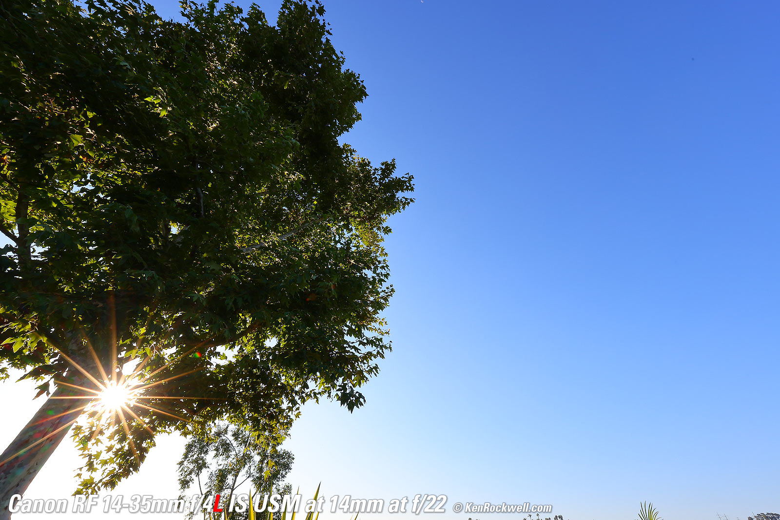 Sunstars performance topWith a 9-bladed rounded diaphragm, I get great 18-pointed sunstars on brilliant points at moderate and small apertures. Ignore the vertical smear at large apertures, this is a sensor artifact called interline transfer smear and not a lens defect. Likewise ignore the crazy rainbow dots at small apertures; these are sensor artifacts caused by taking a picture directly of the sun and exposing for the dark underside of a huge palm tree, and using that same palm tree to hide the sky to accentuate the stars. See also my Sample Images at the top for more. Click any to enlarge: Click any to enlarge.