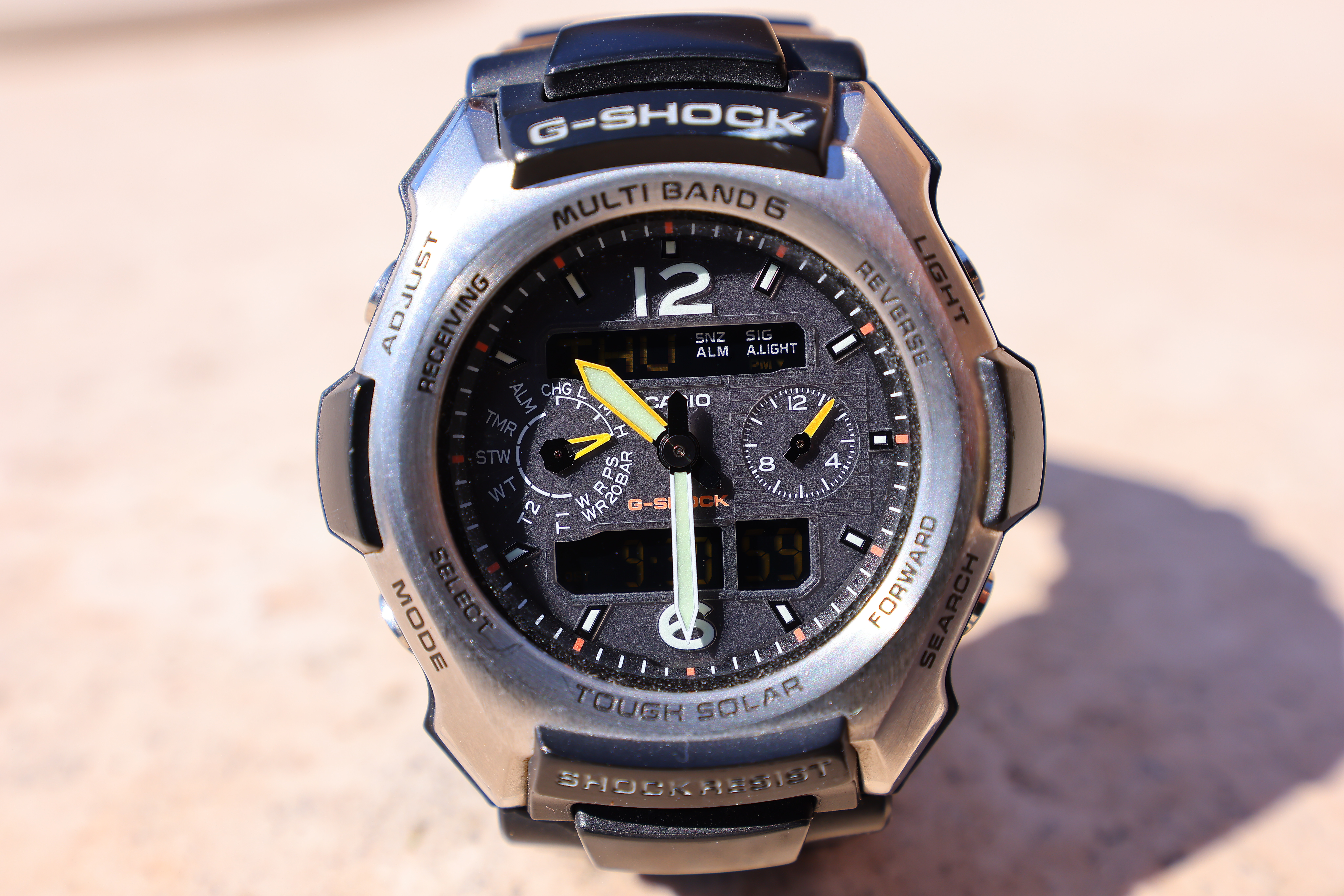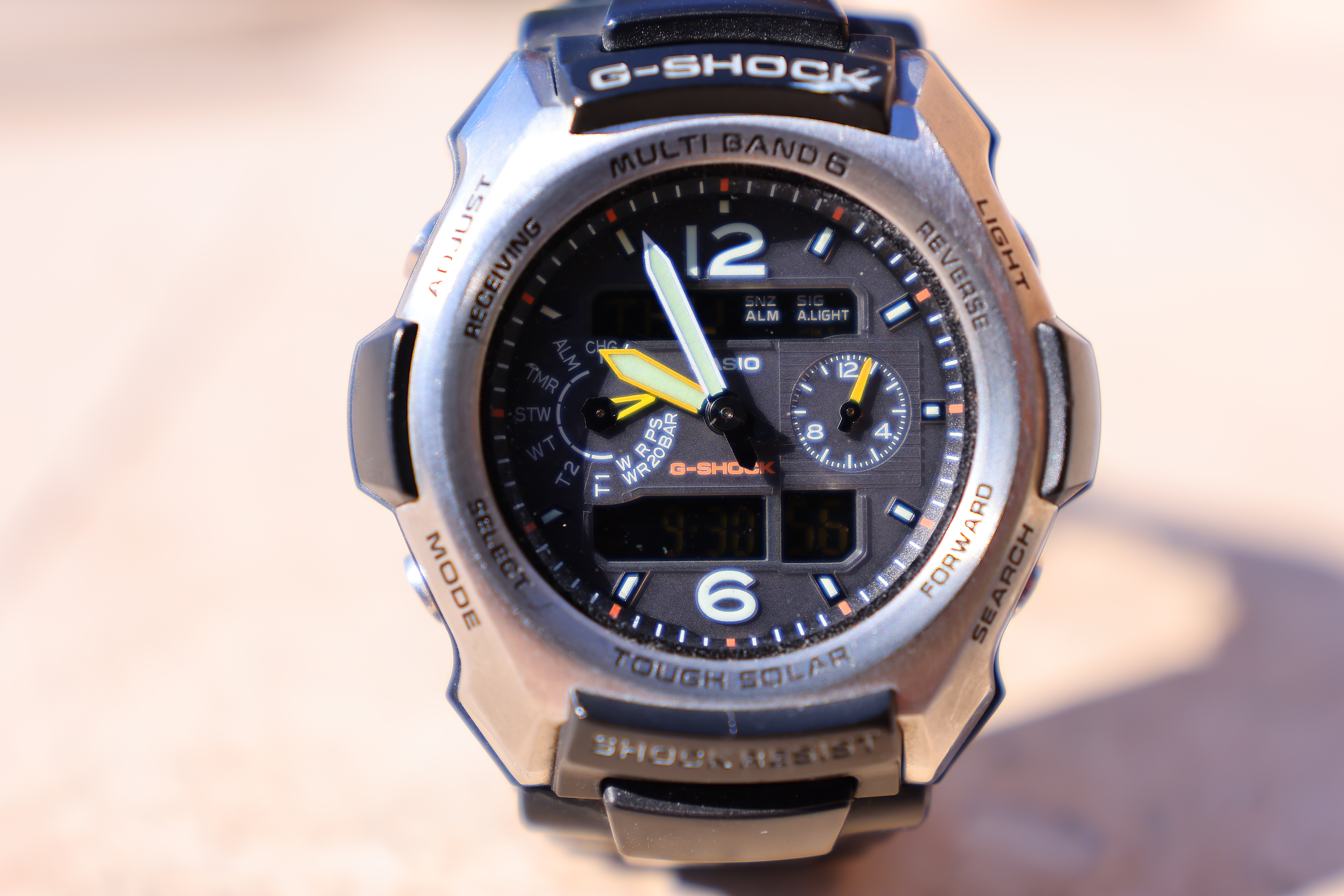 At f/8Like all lenses, it's super-sharp at f/8 and super-close: Casio G-Shock Solar Atomic Watch at close-focus distance at 35mm, 30 September 2021. EOS R5 at 1/250 at Auto ISO 100, +1 stop exposure compensation (LV 14.0). bigger or camera-original © file. 1,200 × 900 pixel (6.8× magnification) crop from above. bigger or camera-original © file. This lens expertly resolved the texture of the watch face. If this 1,200 × 900 pixel crop is about 3" (7.5cm) wide on your screen, the complete image would print at a large 14 × 21″ (35 × 55 cm) at this same high magnification. If this 1,200 × 900 pixel crop is about 6" (15cm) wide on your screen, the complete image would print at a huge 27½ × 41¼″ (70 × 105 cm) at this same high magnification. If this 1,200 × 900 pixel crop is about 12" (30cm) wide on your screen, the complete image would print at a mammoth 55 × 82½″ (1.4 × 2.1 meters) at this same extremely high magnification!
