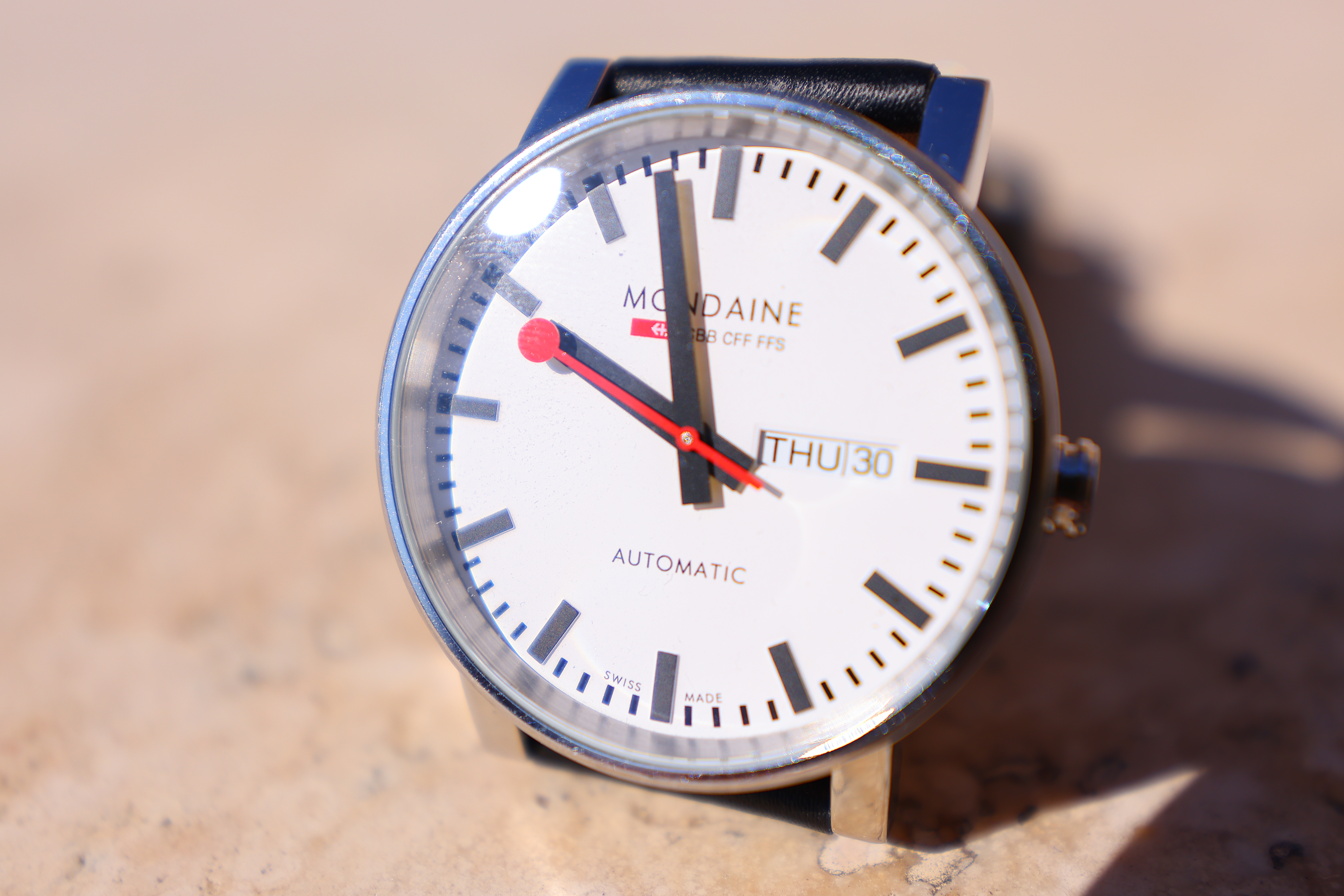 Spherochromatism performance topSpherochromatism, also called secondary spherical chromatic aberration or "color bokeh," is an advanced form of spherical and chromatic aberration in a different dimension than lateral chromatic aberration. It happens mostly in fast normal and tele lenses when spherical aberration at the ends of the color spectrum are corrected differently than in the middle of the spectrum. Spherochromatism can cause colored fringes on out-of-focus highlights, usually seen as green fringes on backgrounds and magenta fringes on foregrounds. Spherochromatism is common in fast lenses of moderate focal length when shooting contrasty items at full aperture. It goes away as stopped down. It has some spherochromatism if I really go looking for it below, but otherwise it's invisible. Mondaine A132.30348.11SBB at close-focus distance at 35mm at f/4, 30 September 2021. EOS R5 at 1/2,000 at Auto ISO 100, +1 stop exposure compensation (LV 15.0). bigger or camera-original © file.