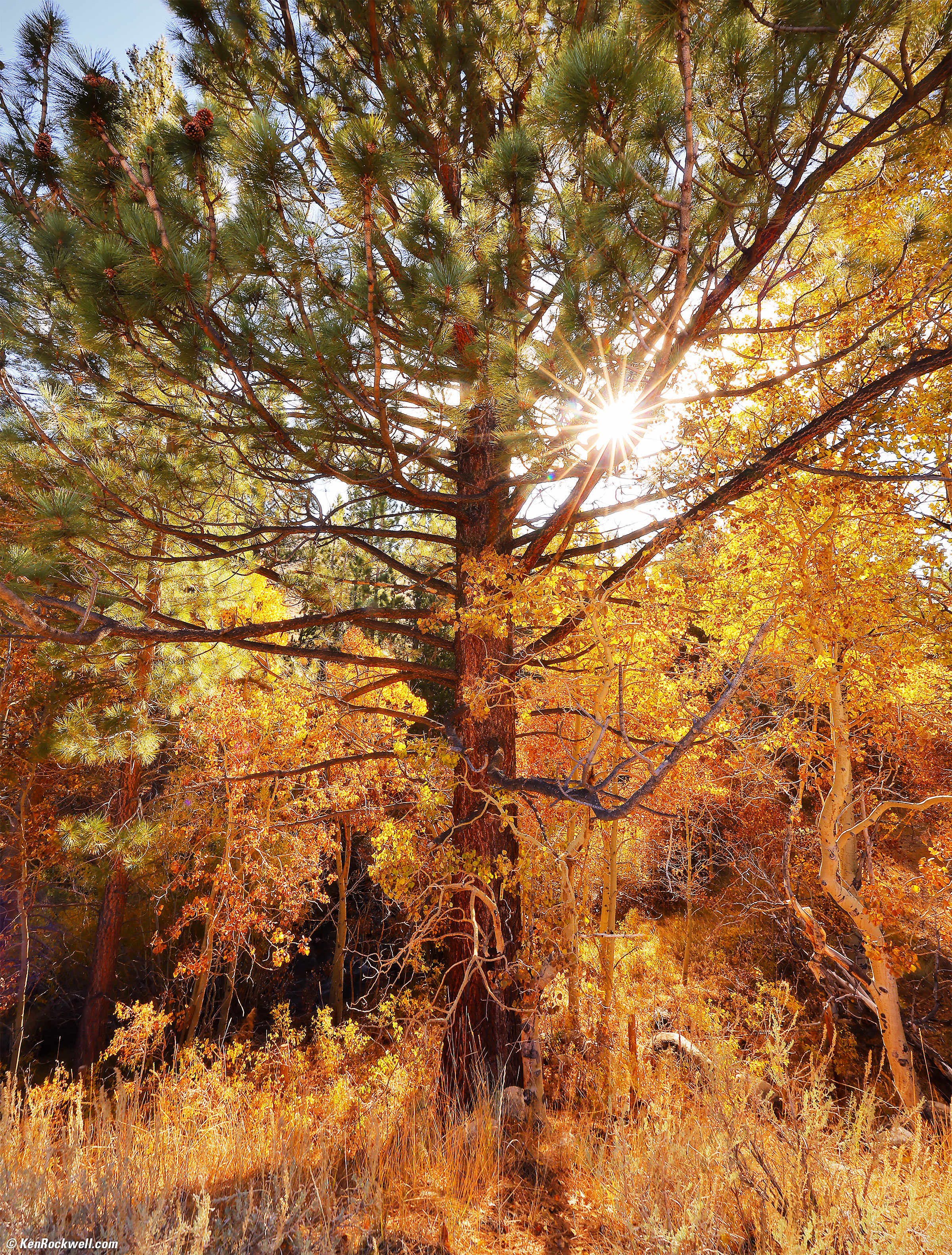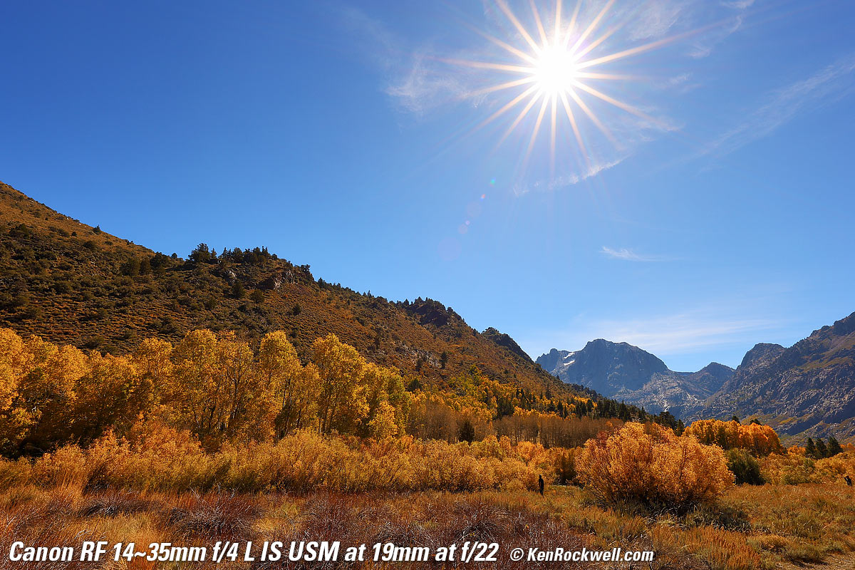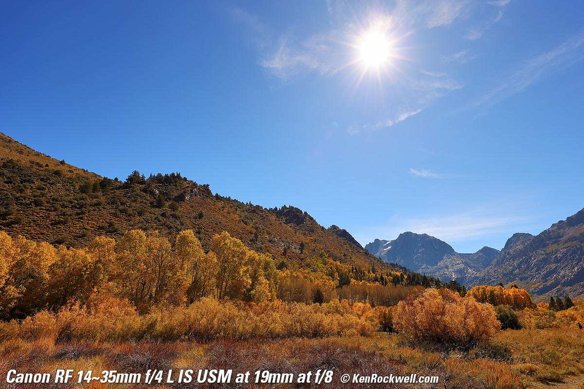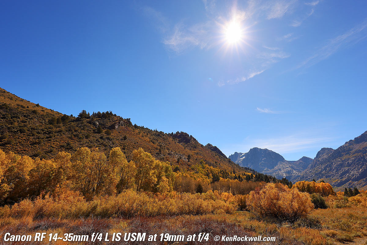 Fall Color and Sunstar, Lee Vining Creek Power Plant Road, 4:01 P.M., Sunday, 17 October 2021. Canon EOS R5, RF 14-35mm f/4L IS USM at 14mm at f/22 (for great sunstars) hand-held at 1/6 of a second at ISO 100 (LV 11.6), shade white balance to enhance the golden colors. bigger or fit-to-screen. Introduction topSample Images Intro New Good Bad Missing Compatibility Specifications USA Version Performance Compared User's Guide