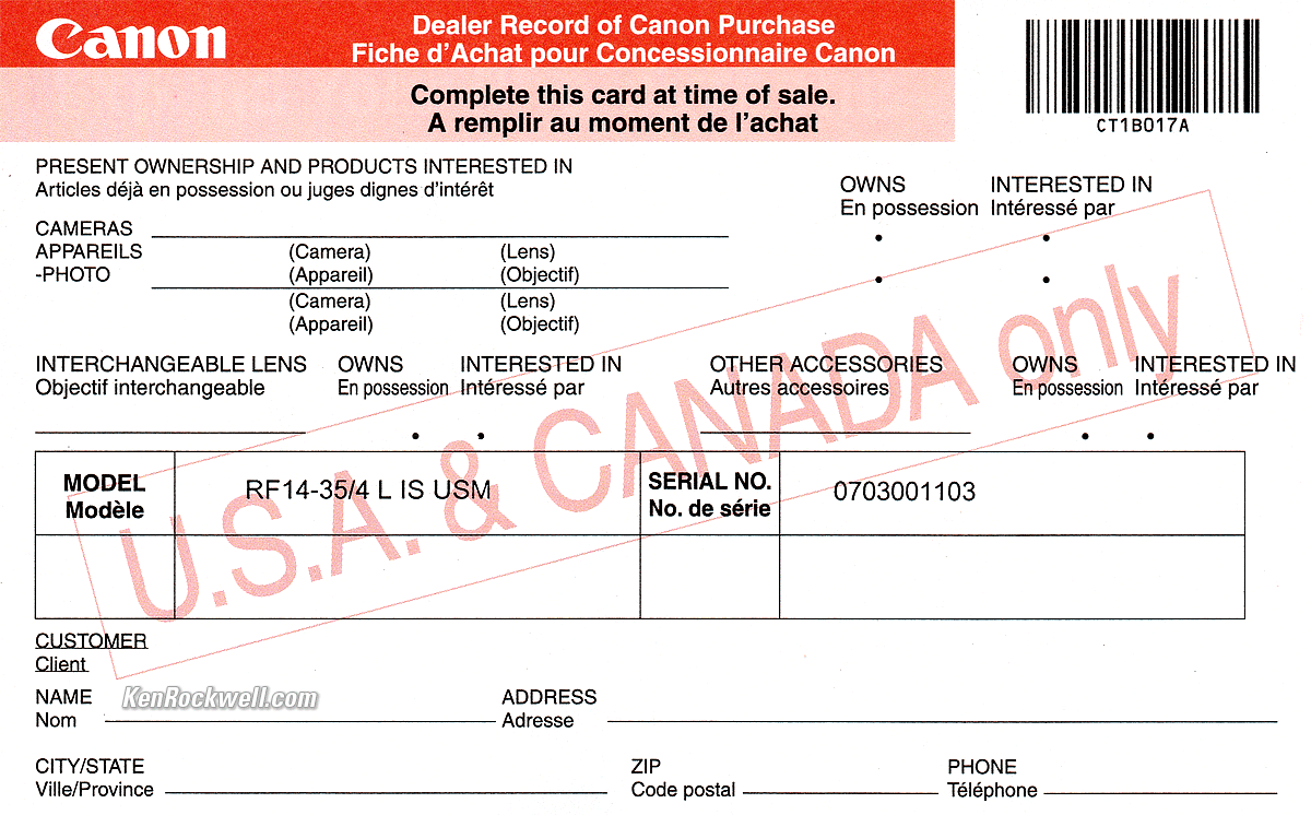 Getting a Legitimate U. S. A. Version topSample Images Intro New Good Bad Missing Compatibility Specifications USA Version Performance Compared User's Guide I got my RF 14-35mm f/4L IS at B&H. I'd also get mine at Adorama, at Amazon or at Crutchfield, or used at eBay if you know How to Win at eBay. This section applies in the U. S. A. only. Canon RF 14-35mm f/4L IS USA Warranty Card. bigger. Your lens must include a U. S. A. warranty card like the one shown above from Canon U.S.A., Inc. It should be on top inside your box as you open it. The serial number on the card must match the serial number on the bottom of your lens. If not, you got ripped off with a gray market version from another country. This is why I never buy anyplace other than from my personally approved sources. You just can't take the chance of buying elsewhere, especially at any retail store, because non-U. S. A. versions have no warranty in the U. S. A., and you probably won't be able to get firmware or service for it — even if you're willing to pay out-of-pocket for it when you need it! Shifty dealers may include color copies of a card from a legitimate U. S. A. lens in a gray-market box, hoping you won't check serial numbers and catch their fraud. A card with the wrong serial number means nothing other than that you have no warranty coverage. The serial number on the box doesn't have to match, but it should. It will be hidden someplace on the sticker with all the bar codes. If not, it means a shady dealer took things out of boxes and was too sloppy to put them back correctly — and it means you got a used lens if anyone other than you took it out of the box. If a gray market version saves you $600 the risk might be worth it, but for $200 or less I wouldn't risk having no warranty or support. Always be sure to check yours while you can still return it, or just don't buy from unapproved sources or at retail so you'll be able to have your camera serviced and get free updated firmware as needed. Get yours from the same places I do and you won't have a problem.