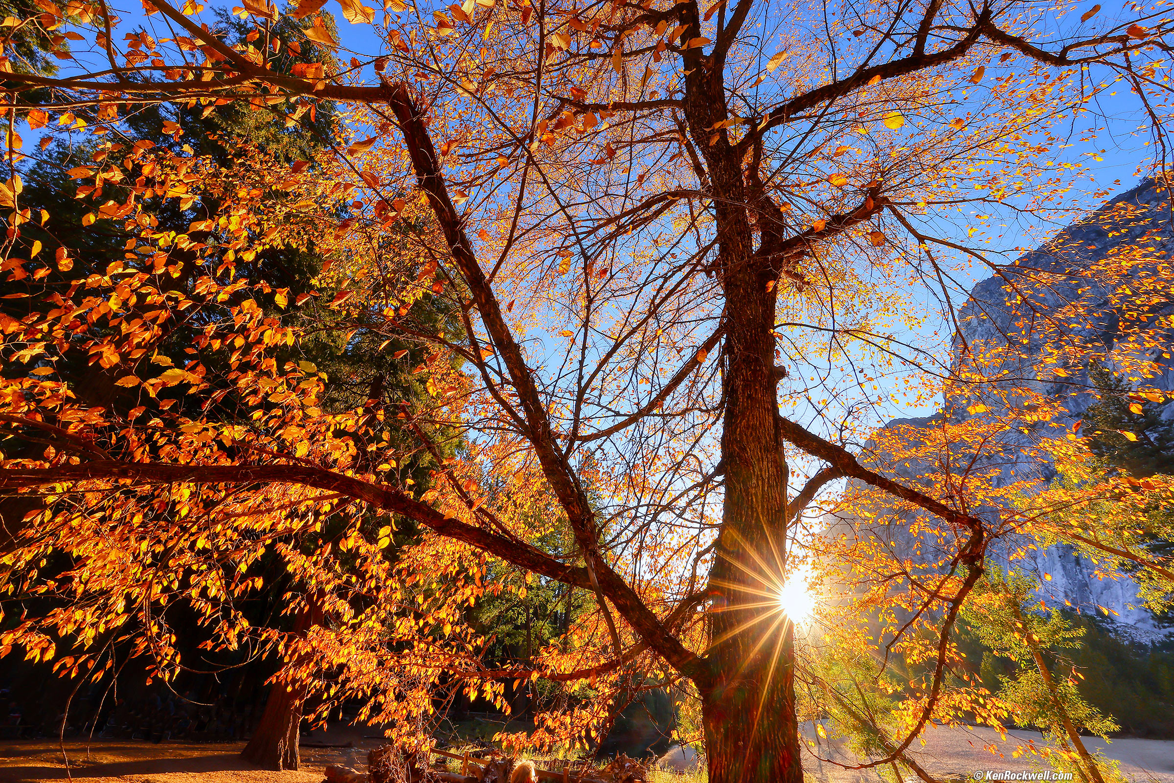 Golden Backlit Trees and Sunstar, Yosemite National Park, 5:33 P.M., 15 October 2021. Canon EOS R5, RF 14-35mm f/4L IS USM at 14mm at f/16 (for a great sunstar) hand held at 1/20 at ISO 100 (LV 12.6), Skylum Aurora HDR to amp-up the color and add emphasis with vignetting. bigger or fit-to-screen.