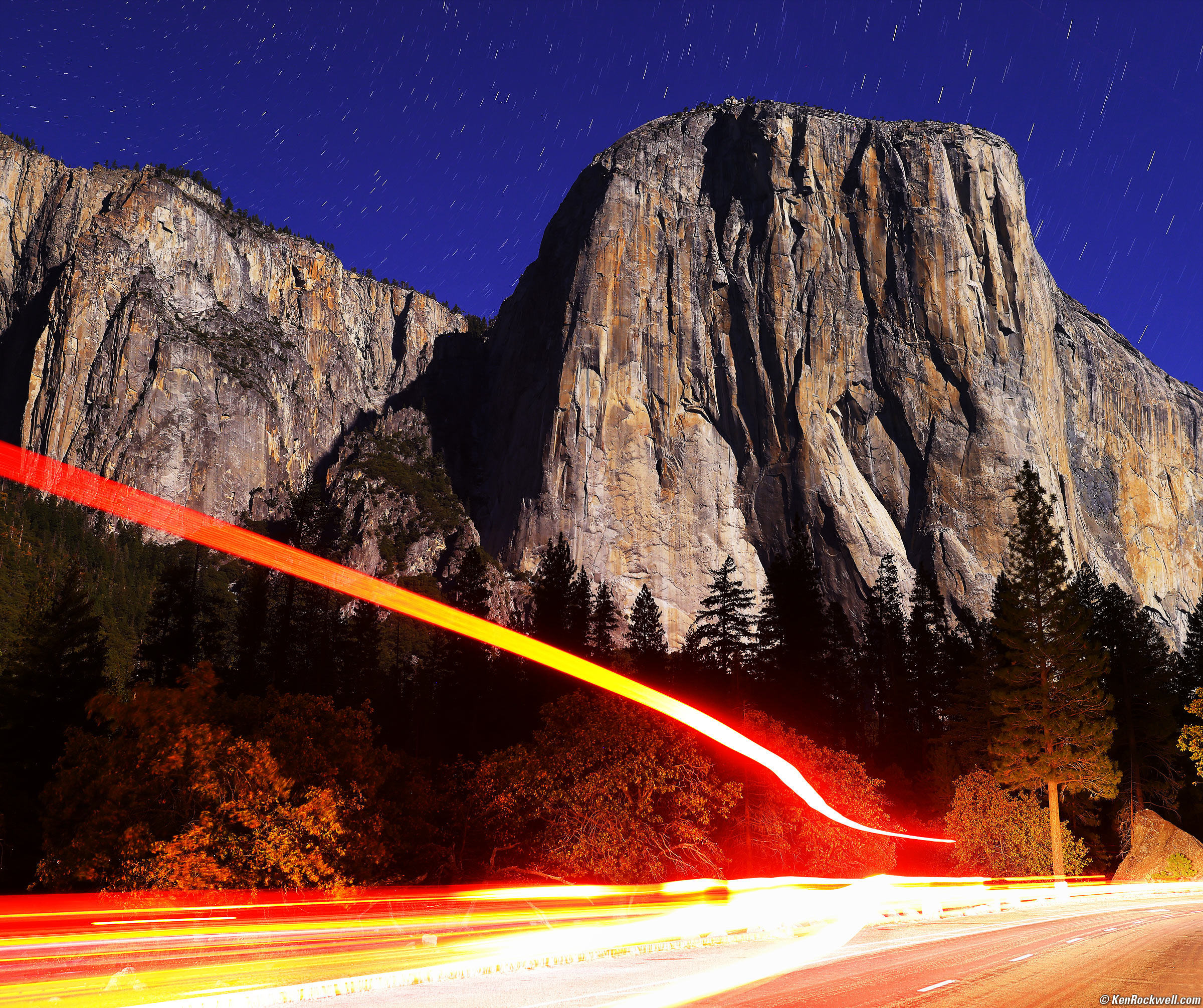 El Capitan with Red Streams by Moonlight — from a different vantage point, 8:45 ~ 8:49 P.M., 16 October 2021. Canon EOS R5, RF 14-35mm f/4L IS USM at 31mm wide-open at f/4 using the R5's bulb timer for a 256-second (four photographic minute) exposure at ISO 100 (LV minus 4.0), Perfectly Clear. bigger or fit-to-screen.