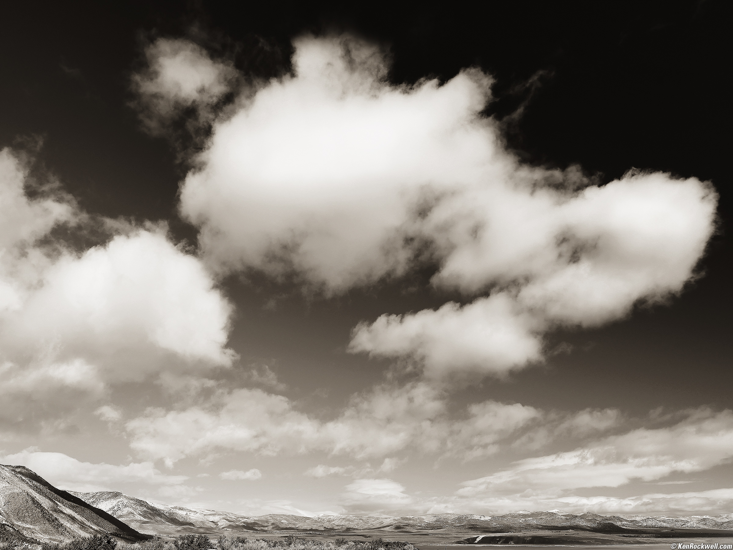 Clouds Over Negit Island, Mono Lake, 10:36 A.M., 18 October 2021. Canon EOS R5 in 4:3 crop mode, RF 14-35mm f/4L IS USM at 23mm at f/8 at 1/200 at Auto ISO 100 (LV 13.6), Perfectly Clear, split-toned print. bigger or fit-to-screen.