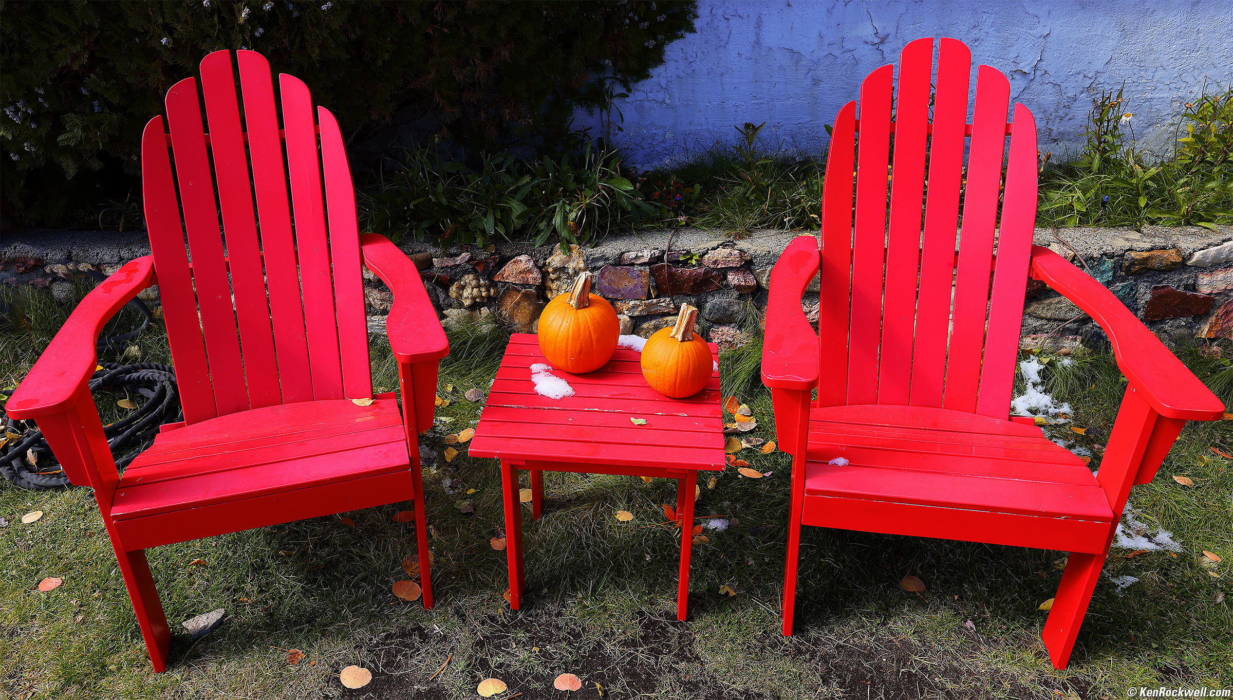 Two Red Adirondack Chairs, Lee Vining, 11:50 A.M., 18 October 2021. Canon EOS R5, RF 14-35mm f/4L IS USM at 25mm at f/8 at 1/100 at Auto ISO 100, -0.7 stops exposure compensation to keep the reds from overloading with STANDARD Picture Style set to +4 Saturation (LV 12.3), Perfectly Clear. bigger or fit-to-screen.