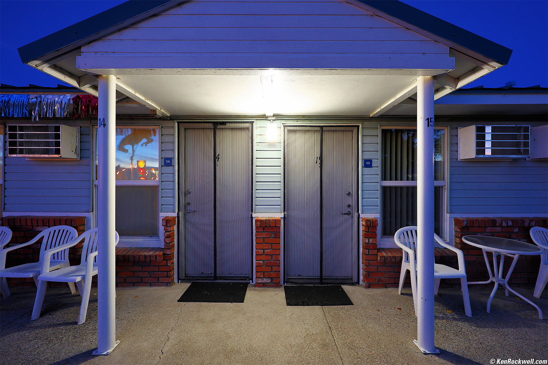 Sample Images topSample Images Intro New Good Bad Missing Compatibility Specifications USA Version Performance Compared User's Guide There are more samples throughout this review at Bokeh, Macro, Spherochromatism and Sunstars. These are all shot hand-held as NORMAL JPGs; no tripods, FINE JPGs or RAW CR3 files were used or needed. Rooms 14 and 15, Redwood Motel, Bridgeport, California, 6:46 P.M., 12 October 2023. Canon EOS R6 II, RF 14-35mm f/4 L IS USM at 14mm, f/4 hand-held at 1/8 at Auto ISO 400 (LV 5.0), minor perspective correction in Photoshop CS6 (from 2012), Perfectly Clear (now sold as Radiant Photo). More tech details. bigger or fit-to-screen.