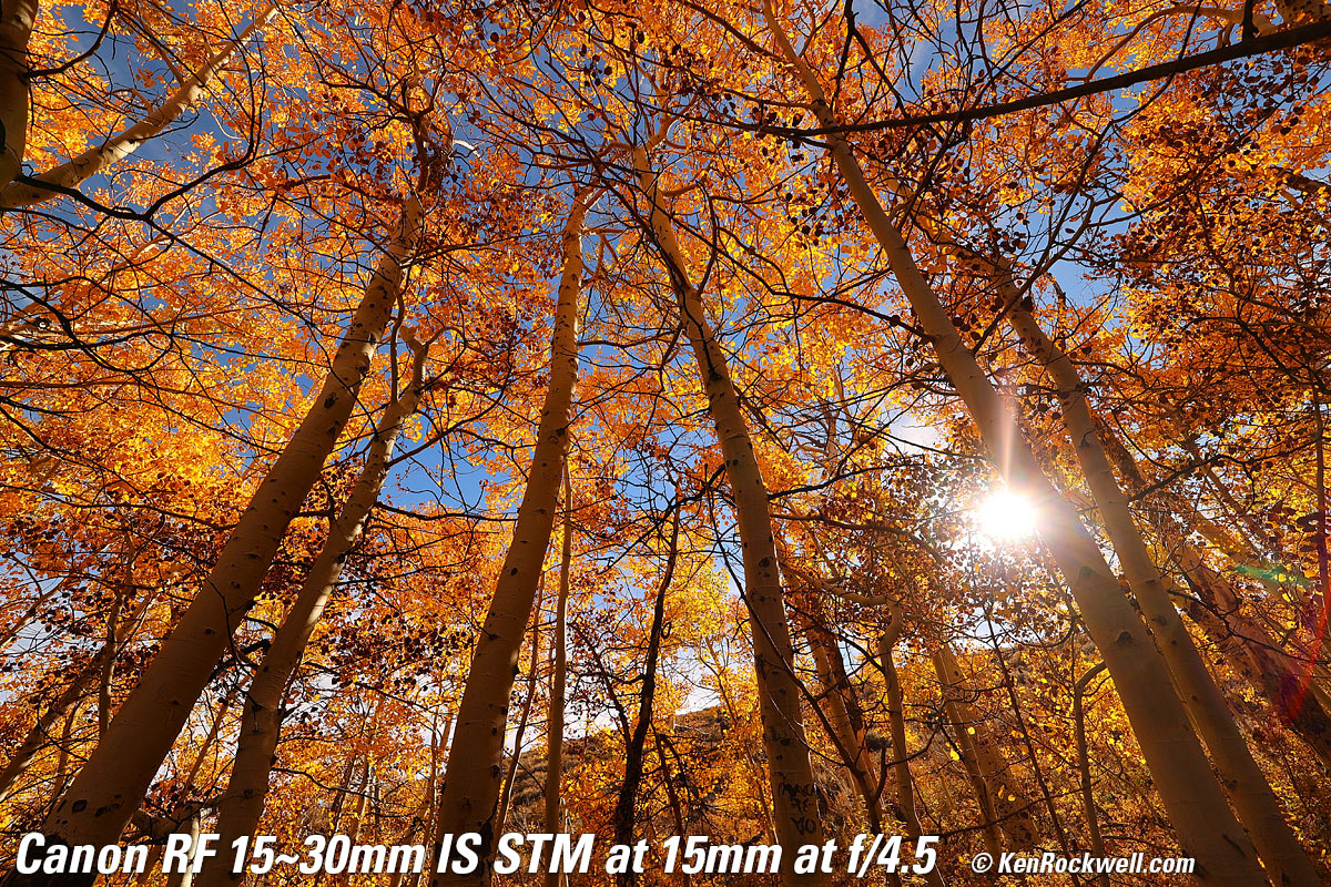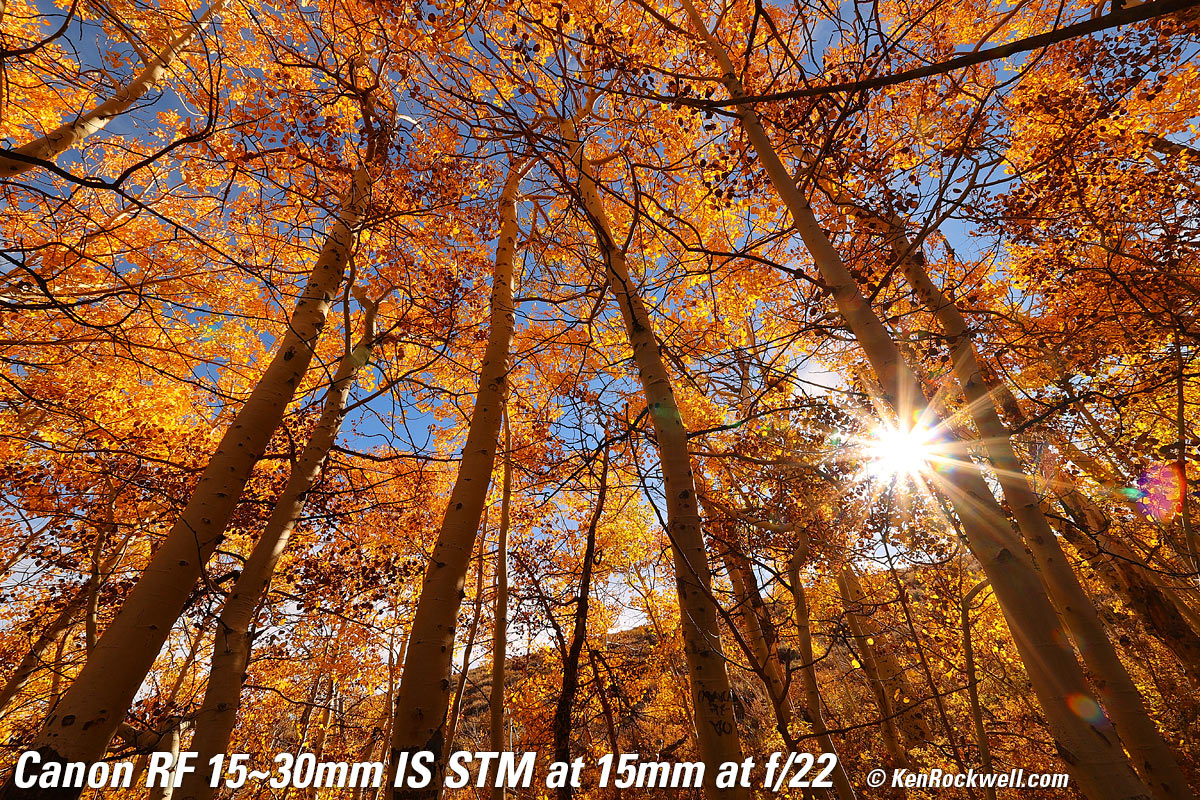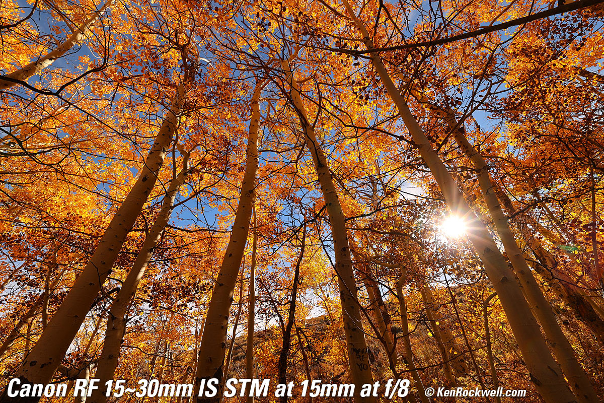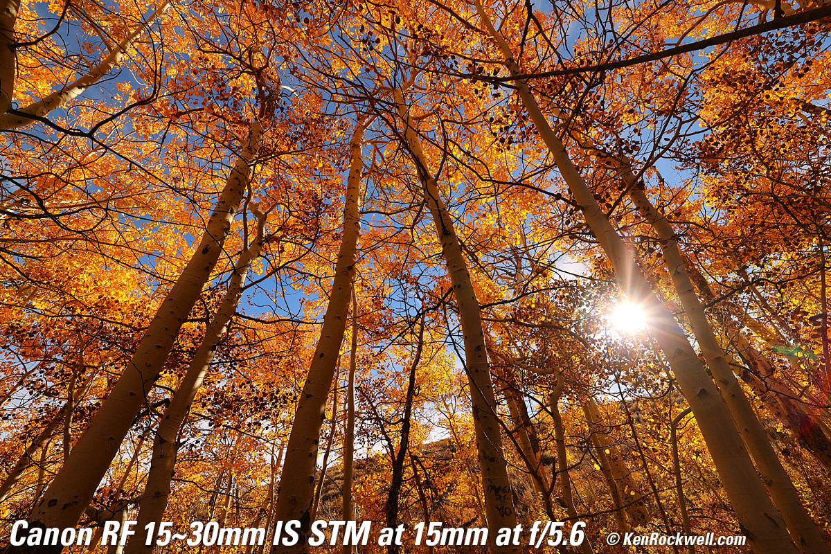 Aspens, Eastern Sierra Nevada, California, 10:00 AM, Wednesday, 19 October 2022. Canon EOS R6, Canon RF 15-30mm IS STM at 15mm at f/11 at 1/125 at Auto ISO 100, -0.3 stops exposure compensation to keep the saturated leaves from overloading the red channel (LV 14.0), Perfectly Clear. bigger or full-resolution 20 MP, 10 MB JPG file. Lens sharpness has nothing to do with picture sharpness; every lens made in the past 100 years is more than sharp enough to make super-sharp pictures if you know what you're doing. The only limitation to picture sharpness is your skill as a photographer. It's the least talented who spend the most time worrying about lens sharpness and blame crummy pictures on their equipment rather than themselves. Skilled photographers make great images with whatever camera is in their hands; I've made some of my best images of all time with an irreparably broken camera! Most pixels are thrown away before you see them, but camera makers don't want you to know that. If you're not getting ultra-sharp pictures with this, be sure not to shoot at f/11 or smaller(as I did above) where all lenses are softer due to diffraction, always shoot at ISO 100 or below because cameras become softer at ISO 200 and above, be sure everything is in perfect focus, set your camera's sharpening as you want it (I set mine to the maximum) and be sure nothing is moving, either camera or subject. If you want to ensure a soft image with any lens, shoot at f/16 or smaller at ISO 1,600 or above at default sharpening in daylight of subjects at differing distances in the same image. People worry waaaaay too much about sharpness. It's not 1968 anymore when lenses often weren't that sharp and there could be significant differences among them; today they are all pretty much equally fantastic. This Canon RF 15-30mm IS STM is super sharp edge-to-edge and corner-to-corner at every setting, as we expect in 2022.