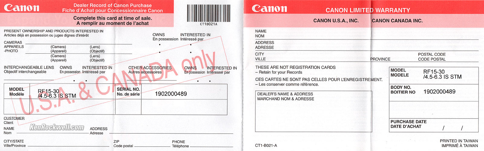 Getting a Legal U. S. A. Version topSample Images Intro New Good Bad Missing Compatibility Specifications USA Version Performance Compared User's Guide I got my RF 15-30mm IS STM at B&H. I'd also get mine at Adorama, at Amazon or at Crutchfield, or used at eBay if you know How to Win at eBay. This section applies in the U. S. A. only. Canon RF 15-30mm IS STM USA Warranty Cards. bigger. Your lens must include a U. S. A. warranty card like the one shown above from Canon U.S.A., Inc. It should be on top inside your box as you open it. The serial number on the card must match the serial number on the bottom of your lens. If not, you got ripped off with a gray market version from another country. This is why I never buy anyplace other than from my personally approved sources. You just can't take the chance of buying elsewhere, especially at any retail store, because non-U. S. A. versions have no warranty in the U. S. A., and you probably won't be able to get firmware or service for it — even if you're willing to pay out-of-pocket for it when you need it! Shifty dealers may include color copies of a card from a legitimate U. S. A. lens in a gray-market box, hoping you won't check serial numbers and catch their fraud. A card with the wrong serial number means nothing other than that you have no warranty coverage. The serial number on the box doesn't have to match, but it should. It will be hidden someplace on the sticker with all the bar codes. If not, it means a shady dealer took things out of boxes and was too sloppy to put them back correctly — and it means you got a used lens if anyone other than you took it out of the box. If a gray market version saves you $250 the risk might be worth it, but for $100 or less I wouldn't risk having no warranty or support. Always be sure to check yours while you can still return it, or just don't buy from unapproved sources or at retail so you'll be able to have your camera serviced and get free updated firmware as needed. Get yours from the same places I do and you won't have a problem.