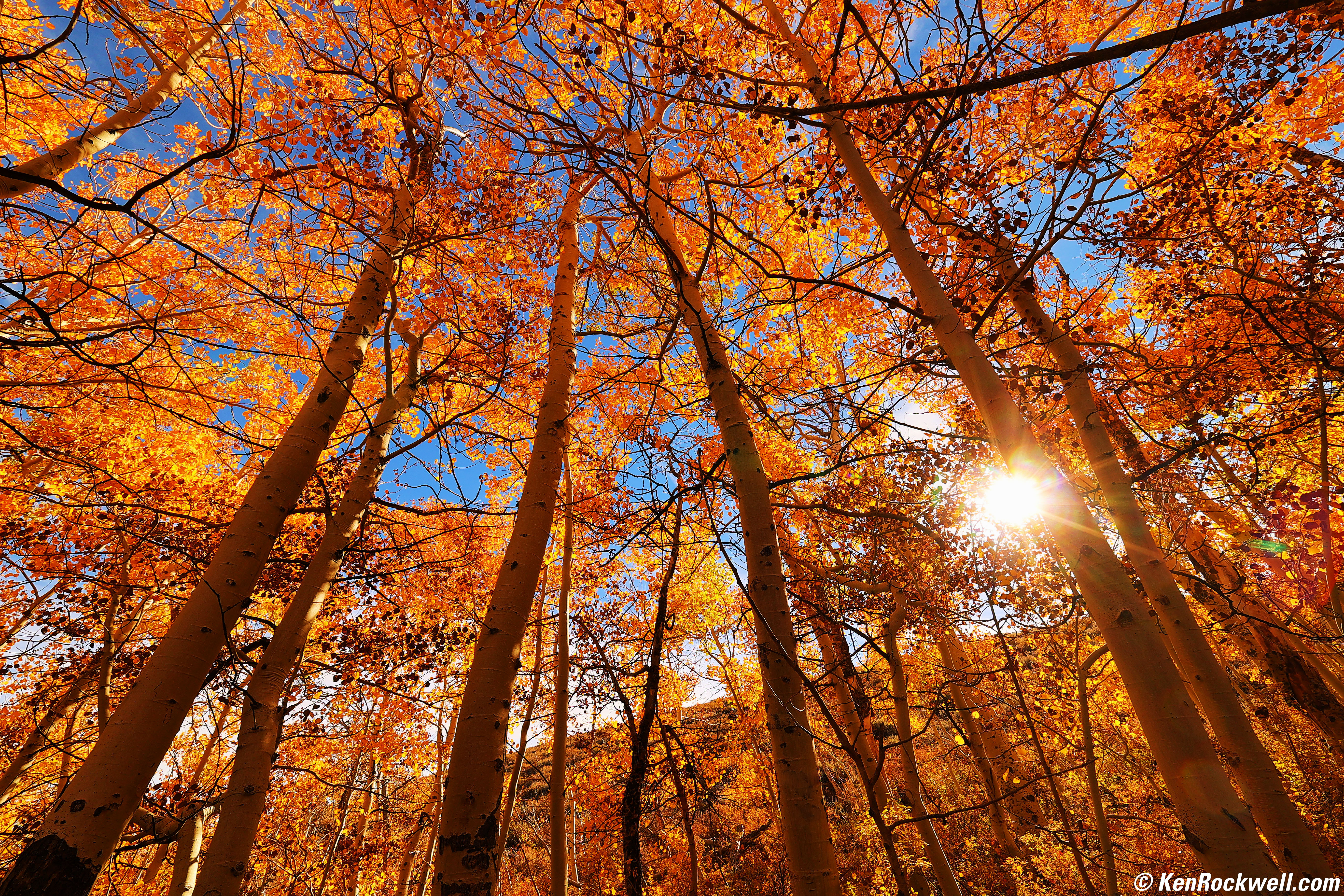 Colorful Aspens off Parker Lake Road, Mammoth Lakes, California, 10:00:01 A.M., 19 October 2022. Canon EOS R6, RF 15-30mm IS STM at 15mm, f/22 at 1/30 at Auto ISO 100, -1/3 stop exposure compensation (LV 14.0). More tech details. bigger or fit-to-screen. I used f/22 for a deliberately huge sunstar, while below f/11 is sharper for you people counting leaves since diffraction is less of a problem at larger apertures: Aspens, Eastern Sierra Nevada, California, 10:00 AM, Wednesday, 19 October 2022. Canon EOS R6, Canon RF 15-30mm IS STM at 15mm at f/11 at 1/125 at Auto ISO 100, -0.3 stops exposure compensation to keep the saturated leaves from overloading the red channel (LV 14.0), Perfectly Clear. bigger or full-resolution 20 MP, 10 MB JPG file.
