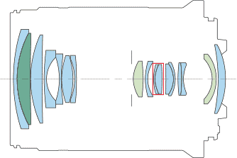 Optics specifications topInternal Optical Construction. UD and Aspherical elements. IS section. 17 elements in 13 groups. 2 aspherical elements. 1 UD element. The front section with filter threads moves in and out as zoomed, while the rear section is fixed. Internal focus. Super Spectra multicoating.