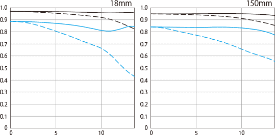 Canon's MTF wide-open at f/3.5 and f/6.3 at 10 cyc/mm (black) and 30 cyc/mm (blue). Sagittal (solid) and meridional (dashed).