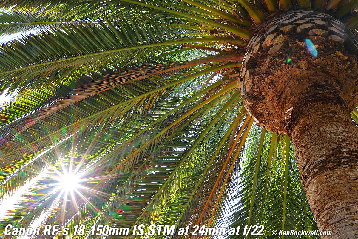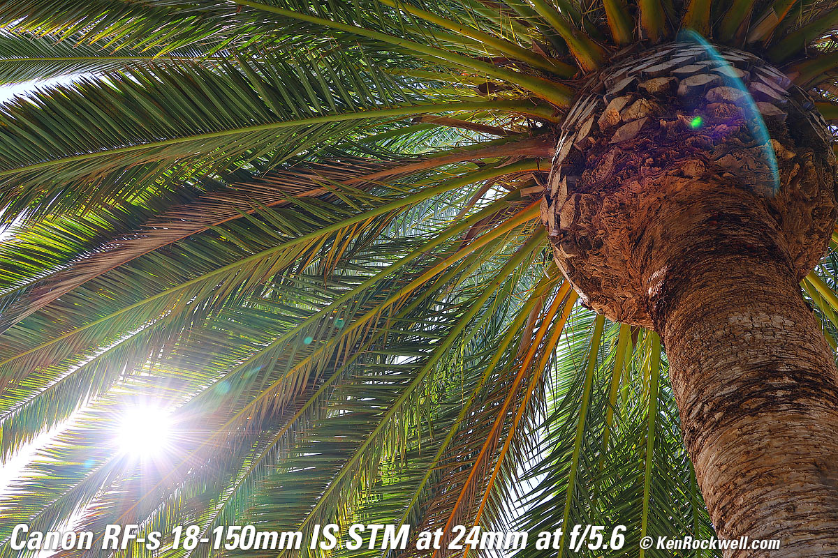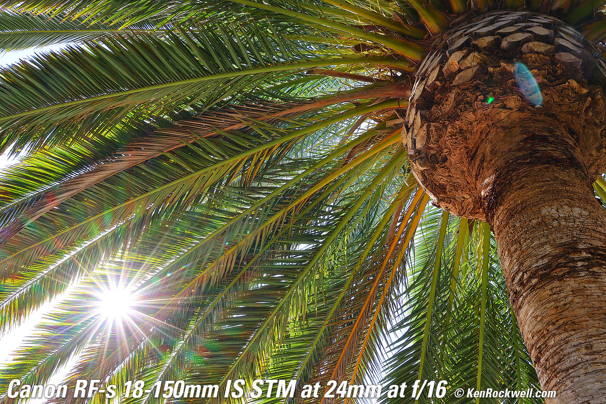 Tree with Glorious Sun Shining Through It, 6:44 PM, Monday, 08 August 2022. Canon EOS R7, OWC ATLAS S PRO 256GB SDXC card, Canon RF-s 18-150mm IS STM at 31mm (50mm equivalent) wide-open at f/4.5 at 1/1,600 at Auto ISO 100 (LV 15.0), Perfectly Clear to get it started and Luminar Aurora HDR (now part of Luminar Neo) to make it explode in color (instead of washed-out sky and dark grass), all from just one NORMAL JPG file. bigger or camera-original (unprocessed) 32 MP © 8 MB NORMAL JPG source file. The hazy aura around the sun is my fault from pushing the software too hard to make an otherwise dull image explode. Lens sharpness has nothing to do with picture sharpness; every lens made in the past 100 years is more than sharp enough to make super-sharp pictures if you know what you're doing. The only limitation to picture sharpness is your skill as a photographer. It's the least talented who spend the most time worrying about lens sharpness and blame crummy pictures on their equipment rather than themselves. Skilled photographers make great images with whatever camera is in their hands; I've made some of my best images of all time with an irreparably broken camera! Most pixels are thrown away before you see them, but camera makers don't want you to know that. If you're not getting ultra-sharp pictures with this, be sure not to shoot at f/11 or smaller where all lenses are softer due to diffraction, always shoot at ISO 100 or below because cameras become softer at ISO 200 and above, be sure everything is in perfect focus, set your camera's sharpening as you want it (I set mine to the maximum) and be sure nothing is moving, either camera or subject. If you want to ensure a soft image with any lens, shoot at f/16 or smaller at ISO 1,600 or above at default sharpening in daylight of subjects at differing distances in the same image. People worry waaaaay too much about sharpness. It's not 1968 anymore when lenses often weren't that sharp and there could be significant differences among them; today they are all pretty much equally fantastic. This lens is ultrasharp. The only slight imperfection I can see is in the very far corners at 18mm at f/3.5 it can be just a tiny bit softer, but you're not going to see anything other than perfection in actual real-world shots. Here's how sharp it is wide-open at 18mm: Canary Palm, 9:33 AM, Sunday, 08 August 2022. Canon EOS R7, OWC ATLAS S PRO 256GB SDXC card, Canon RF-s 18-150mm IS STM at 18mm (28mm equivalent) wide-open at f/3.5 at 1/125 at Auto ISO 100 (LV 10.6). bigger or camera-original (unprocessed) 32 MP © 14 MB NORMAL JPG source file. Remember that very little is in focus; I'm focused on the ball of the pineapple. Stopped down to f/8 more is in focus: Canary Palm, 9:33 AM, Sunday, 08 August 2022. Canon EOS R7, OWC ATLAS S PRO 256GB SDXC card, Canon RF-s 18-150mm IS STM at 18mm (28mm equivalent) at f/8 hand-held at 1/25 at Auto ISO 100 (LV 10.6). bigger or camera-original (unprocessed) 32 MP © 15 MB NORMAL JPG source file.