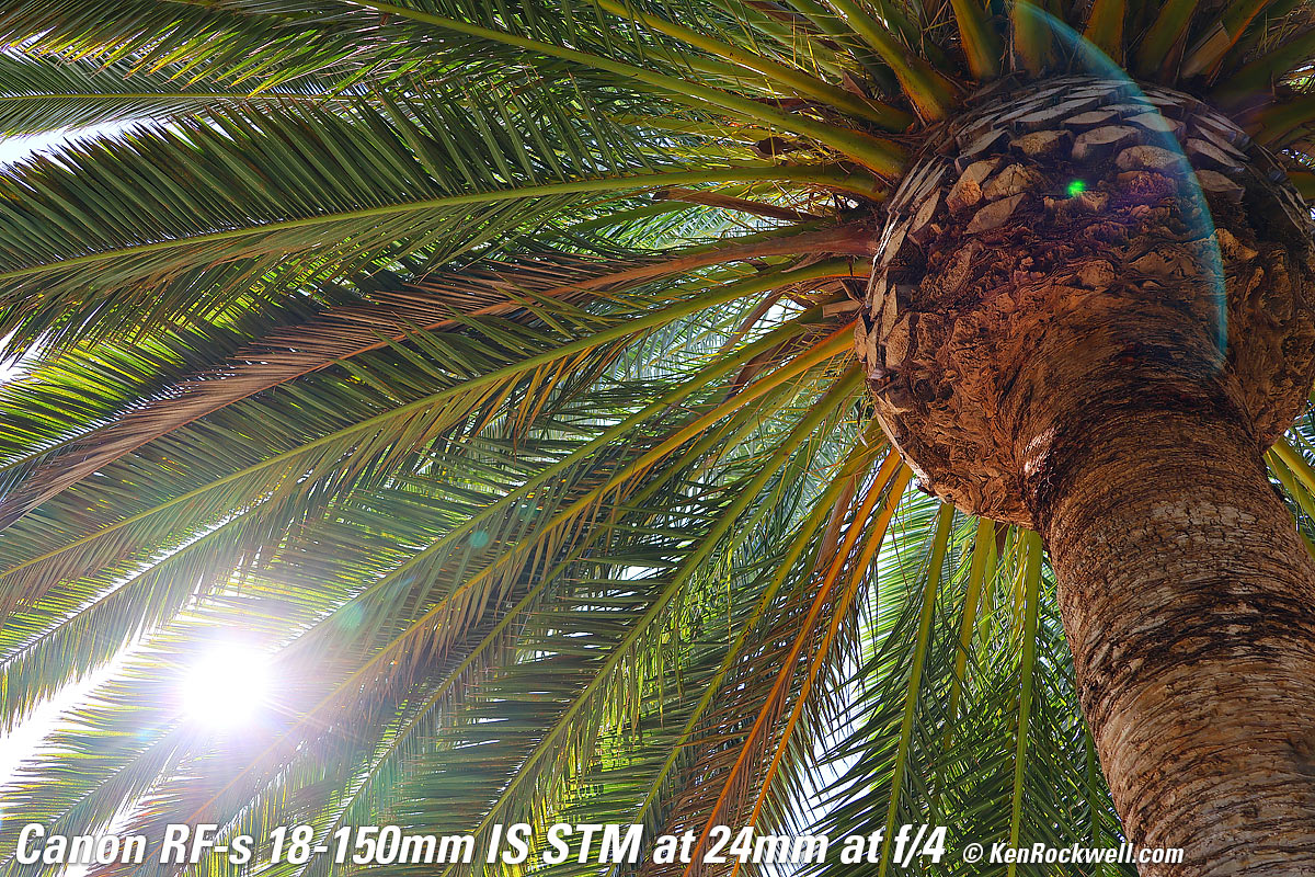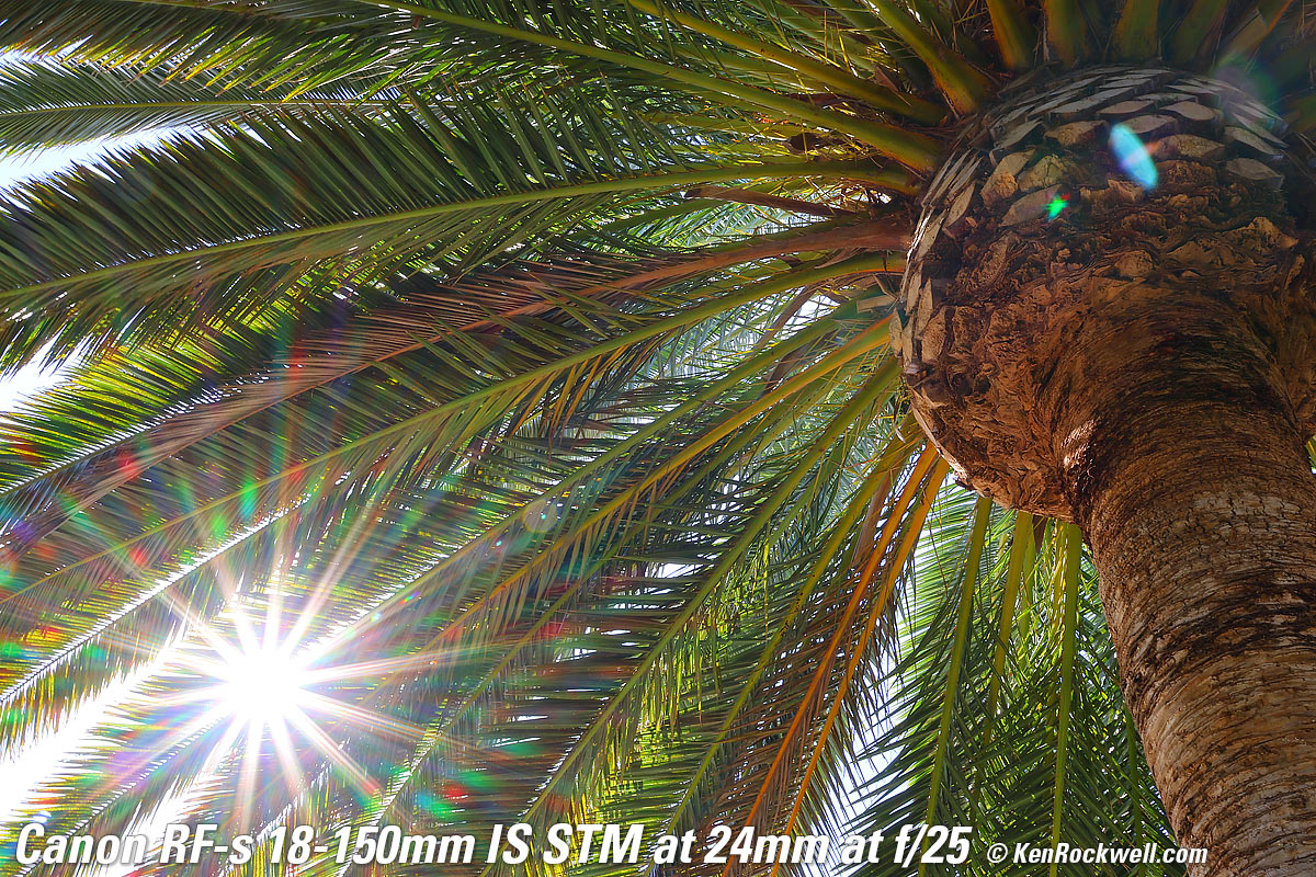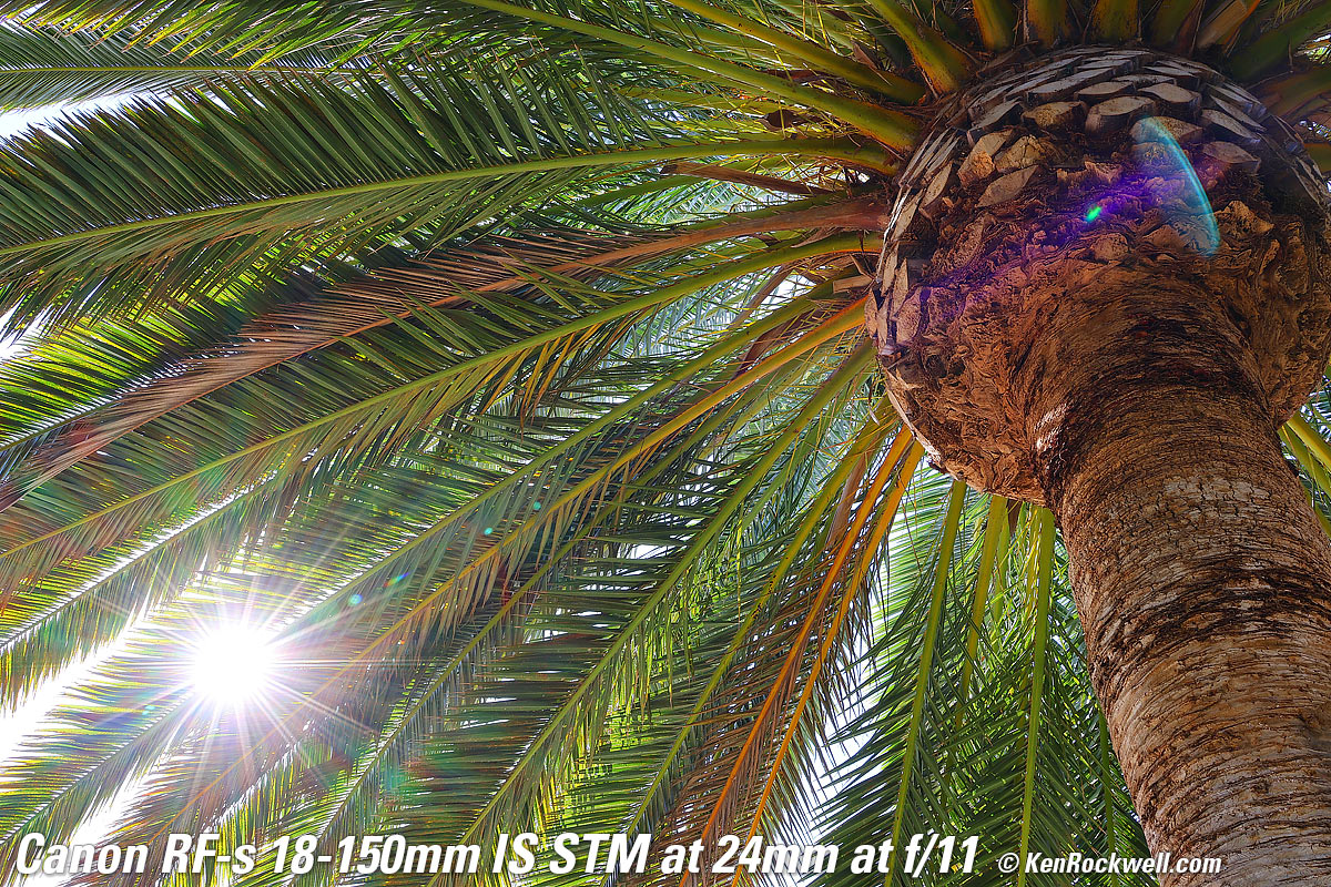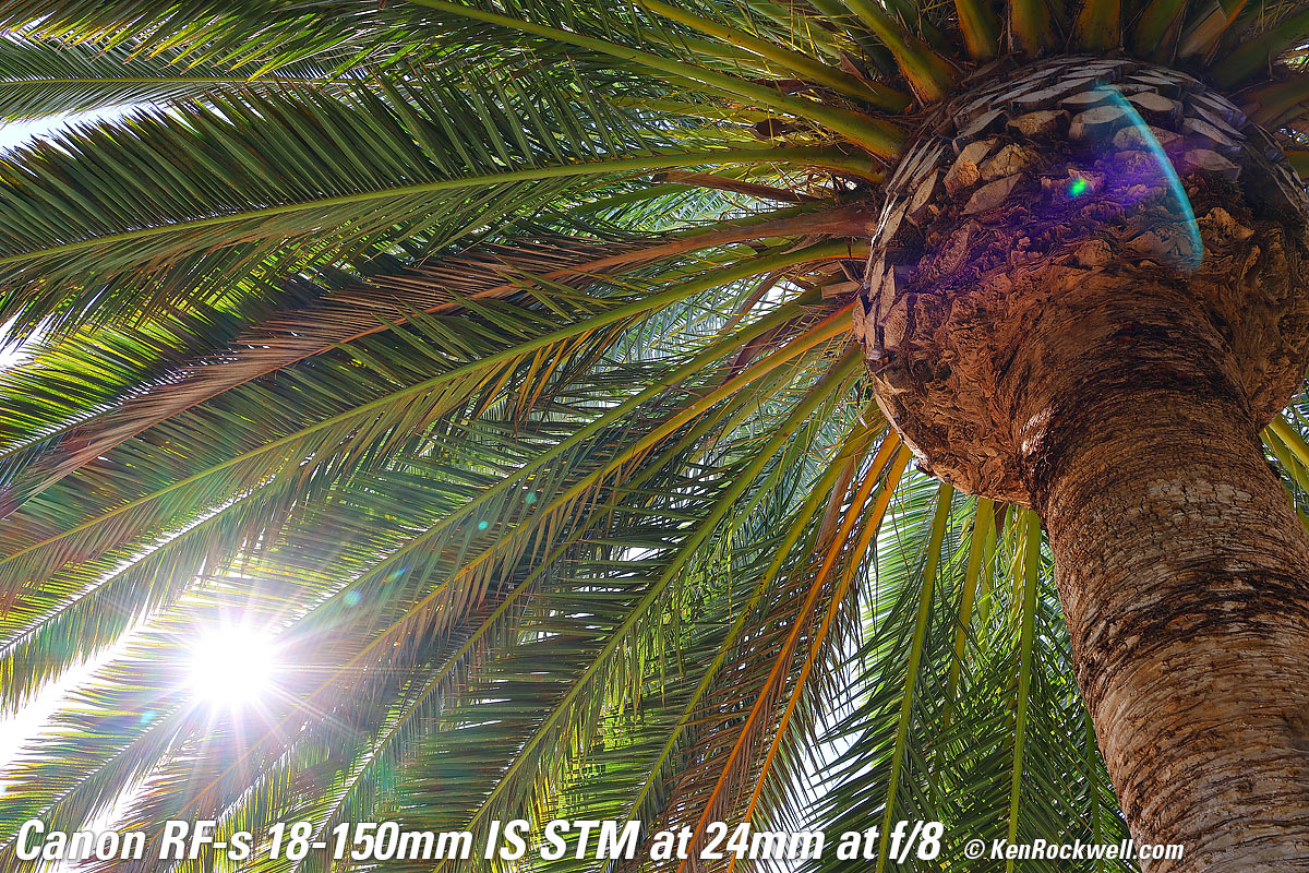 Tree with Glorious Sun Shining Through It, 6:44 PM, Monday, 08 August 2022. Canon EOS R7, OWC ATLAS S PRO 256GB SDXC card, Canon RF-s 18-150mm IS STM at 31mm (50mm equivalent) wide-open at f/4.5 at 1/1,600 at Auto ISO 100 (LV 15.0), Perfectly Clear to get it started and Luminar Aurora HDR (now part of Luminar Neo) to make it explode in color (instead of washed-out sky and dark grass), all from just one NORMAL JPG file. bigger or camera-original (unprocessed) 32 MP © 8 MB NORMAL JPG source file. The hazy aura around the sun is my fault from pushing the software too hard to make an otherwise dull image explode. Lens sharpness has nothing to do with picture sharpness; every lens made in the past 100 years is more than sharp enough to make super-sharp pictures if you know what you're doing. The only limitation to picture sharpness is your skill as a photographer. It's the least talented who spend the most time worrying about lens sharpness and blame crummy pictures on their equipment rather than themselves. Skilled photographers make great images with whatever camera is in their hands; I've made some of my best images of all time with an irreparably broken camera! Most pixels are thrown away before you see them, but camera makers don't want you to know that. If you're not getting ultra-sharp pictures with this, be sure not to shoot at f/11 or smaller where all lenses are softer due to diffraction, always shoot at ISO 100 or below because cameras become softer at ISO 200 and above, be sure everything is in perfect focus, set your camera's sharpening as you want it (I set mine to the maximum) and be sure nothing is moving, either camera or subject. If you want to ensure a soft image with any lens, shoot at f/16 or smaller at ISO 1,600 or above at default sharpening in daylight of subjects at differing distances in the same image. People worry waaaaay too much about sharpness. It's not 1968 anymore when lenses often weren't that sharp and there could be significant differences among them; today they are all pretty much equally fantastic. This lens is ultrasharp. The only slight imperfection I can see is in the very far corners at 18mm at f/3.5 it can be just a tiny bit softer, but you're not going to see anything other than perfection in actual real-world shots. Here's how sharp it is wide-open at 18mm: Canary Palm, 9:33 AM, Sunday, 08 August 2022. Canon EOS R7, OWC ATLAS S PRO 256GB SDXC card, Canon RF-s 18-150mm IS STM at 18mm (28mm equivalent) wide-open at f/3.5 at 1/125 at Auto ISO 100 (LV 10.6). bigger or camera-original (unprocessed) 32 MP © 14 MB NORMAL JPG source file. Remember that very little is in focus; I'm focused on the ball of the pineapple. Stopped down to f/8 more is in focus: Canary Palm, 9:33 AM, Sunday, 08 August 2022. Canon EOS R7, OWC ATLAS S PRO 256GB SDXC card, Canon RF-s 18-150mm IS STM at 18mm (28mm equivalent) at f/8 hand-held at 1/25 at Auto ISO 100 (LV 10.6). bigger or camera-original (unprocessed) 32 MP © 15 MB NORMAL JPG source file.