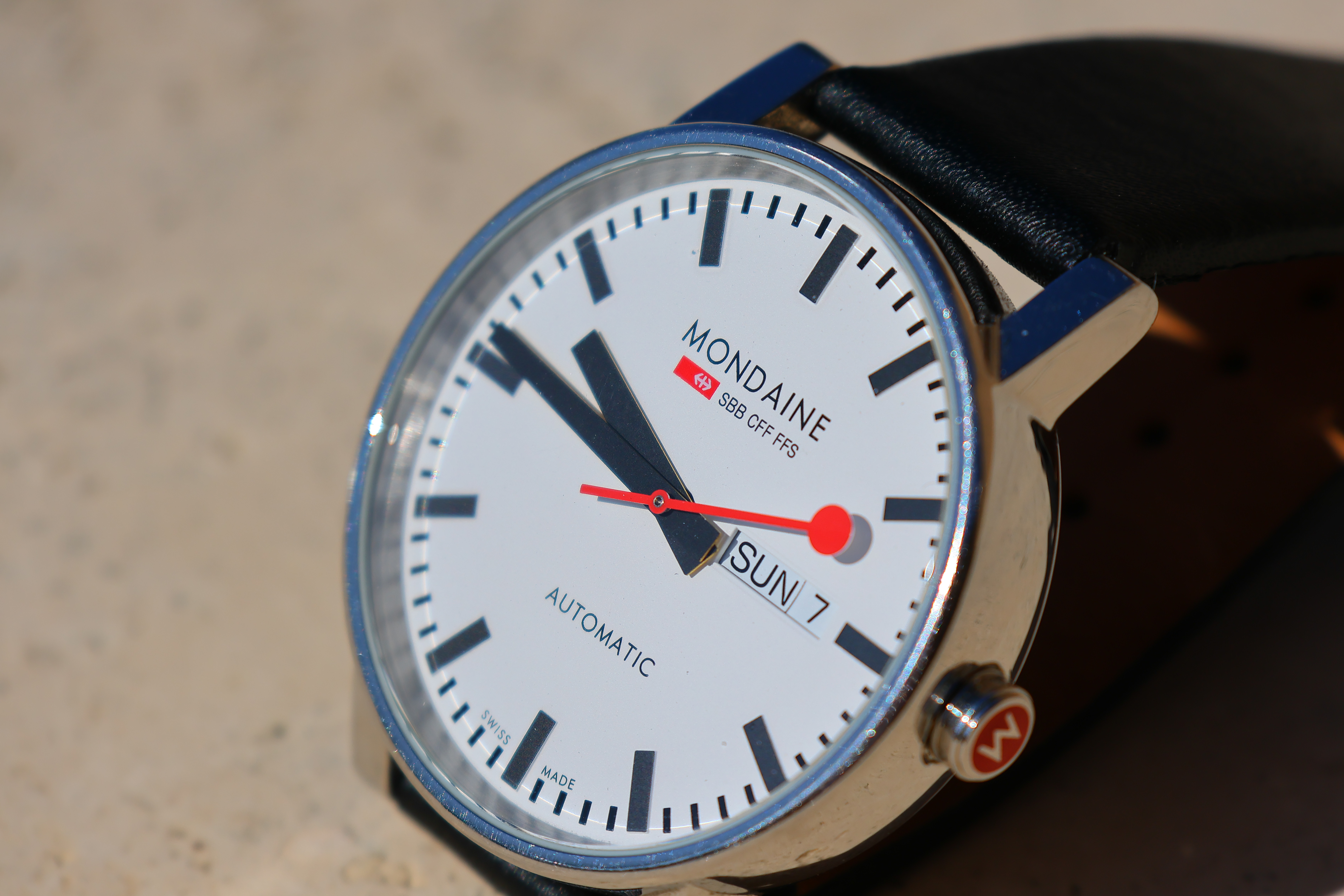 At 50mm wide-open at f/5.6It gets even closer at 50mm, but what you can't see here is that the Mondaine watch is so close to my lens that I had to work very carefully to let the light stream in from the top left without casting the lens' shadow on the watch face. I had to position the watch very carefully, either the sun wouldn't shine on the watch or I'd cast a shadow. It does get close, and it is surprisingly sharp. This watch has a convex mineral glass crystal, so don't fret that the minute marks aren't super sharp. I didn't have the luxury of making sure that everything was parallel, either. Mondaine A132.30348.11SBB at closest autofocus distance at 50mm, 31 August 2022 (I was too lazy to set my watch for this photo). Canon EOS R7, RF-s 18-150mm IS STM at 50mm wide-open at f/5.6 at 1/1,250 at ISO 100, -0.7 stops exposure compensation (LV 15.4). bigger.