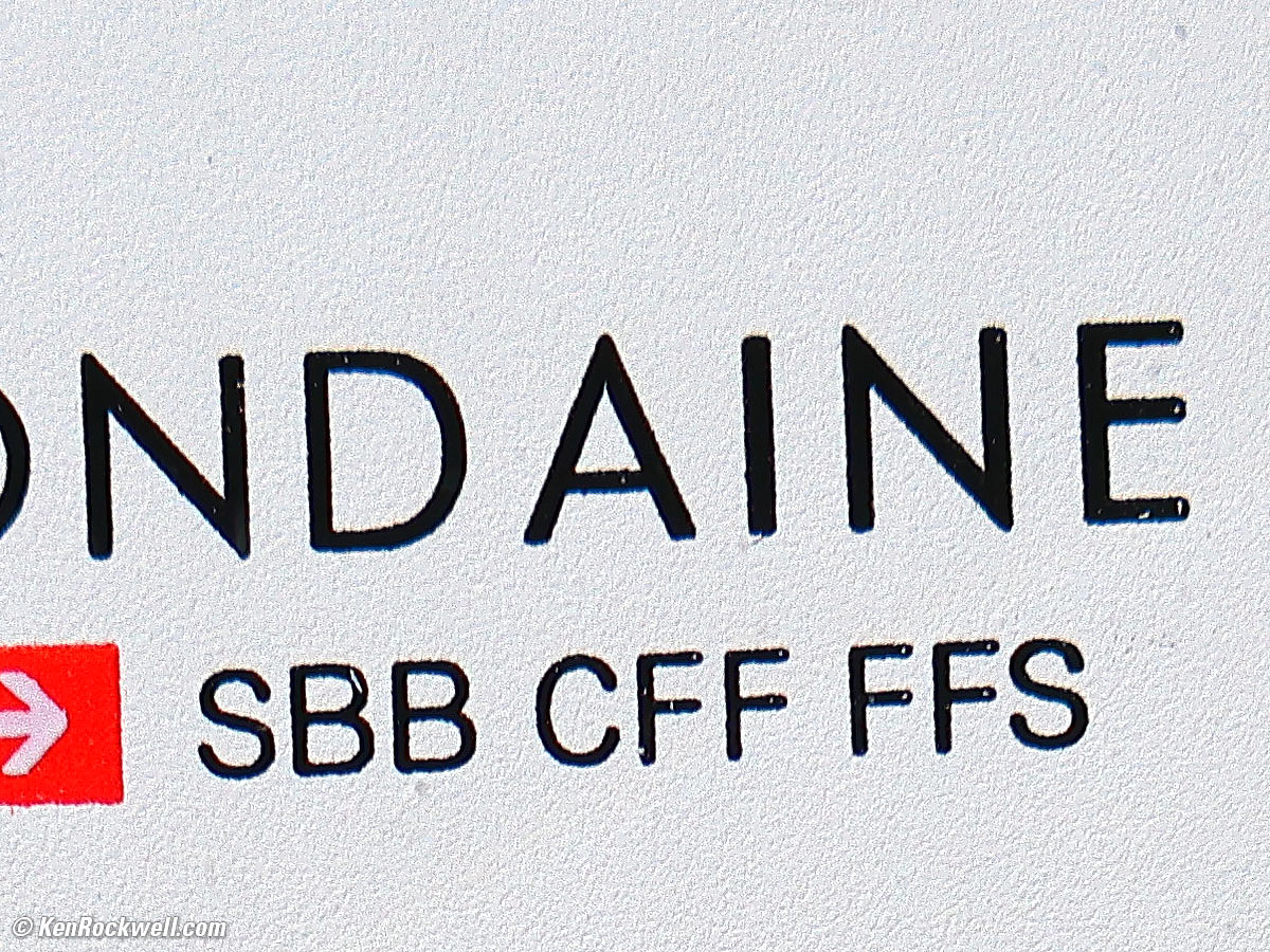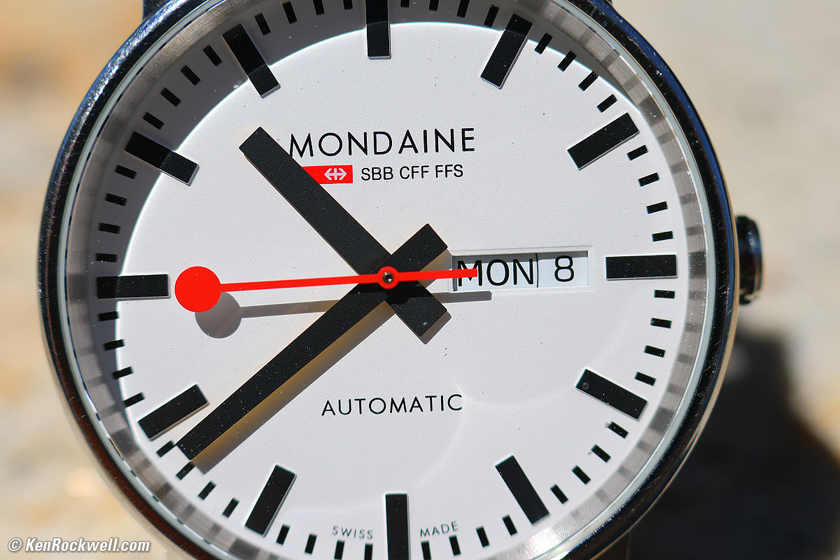 1,200 × 900 pixel (5.84× magnification) crop from above. bigger. Wow! I never realized the painted face of this Swiss watch had a slight texture to it. This is a sharp lens. This watch has a convex mineral glass crystal, so don't fret that there's some slight color fringing on the MONDAINE letters. At even shorter focal lengths (18-24mm) at even closer manual-focus-only distances Canon cautions that this would be a trick mode, with much softer corners. Stay at 50mm or longer and in the autofocus range and you're sharp, use the shorter focal lengths and ultra-close manual focus and you have softer sides, but by then you're so close that your subject is right on the front of the lens and not easy to photograph. If this 1,200 × 900 pixel crop is about 3" (8cm) wide on your screen, then the complete image printed at this same extreme magnification would be about 12 × 18" (30 × 45 cm). If this 1,200 × 900 pixel crop is about 6" (15cm) wide on your screen, then the complete image printed at this same extreme magnification would be about 23 × 35" (59 × 89 cm). If this 1,200 × 900 pixel crop is about 12" (30cm) wide on your screen, then the complete image printed at this same extreme magnification would be about 47 × 70" (1.2 × 1.8 meters).