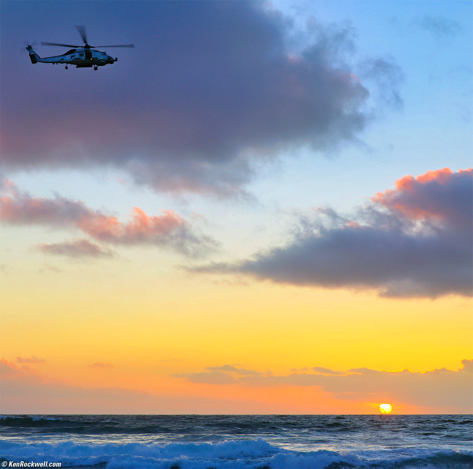 Coast Guard Helicopter at Sunset, Cardiff Seaside Reef, California, 5:58 PM, Monday, 28 October 2024. Square crop from Canon EOS R5 II, RF 24-240mm IS USM at 55mm at f/7.1 at 1/125 at Auto ISO 200 (LV 14.6) in Highlight Tone Priority D+ mode (MENU > CAMERA page 3 > Highlight tone priority > D+), Radiant Photo and Skylum Luminar Neo software. bigger.