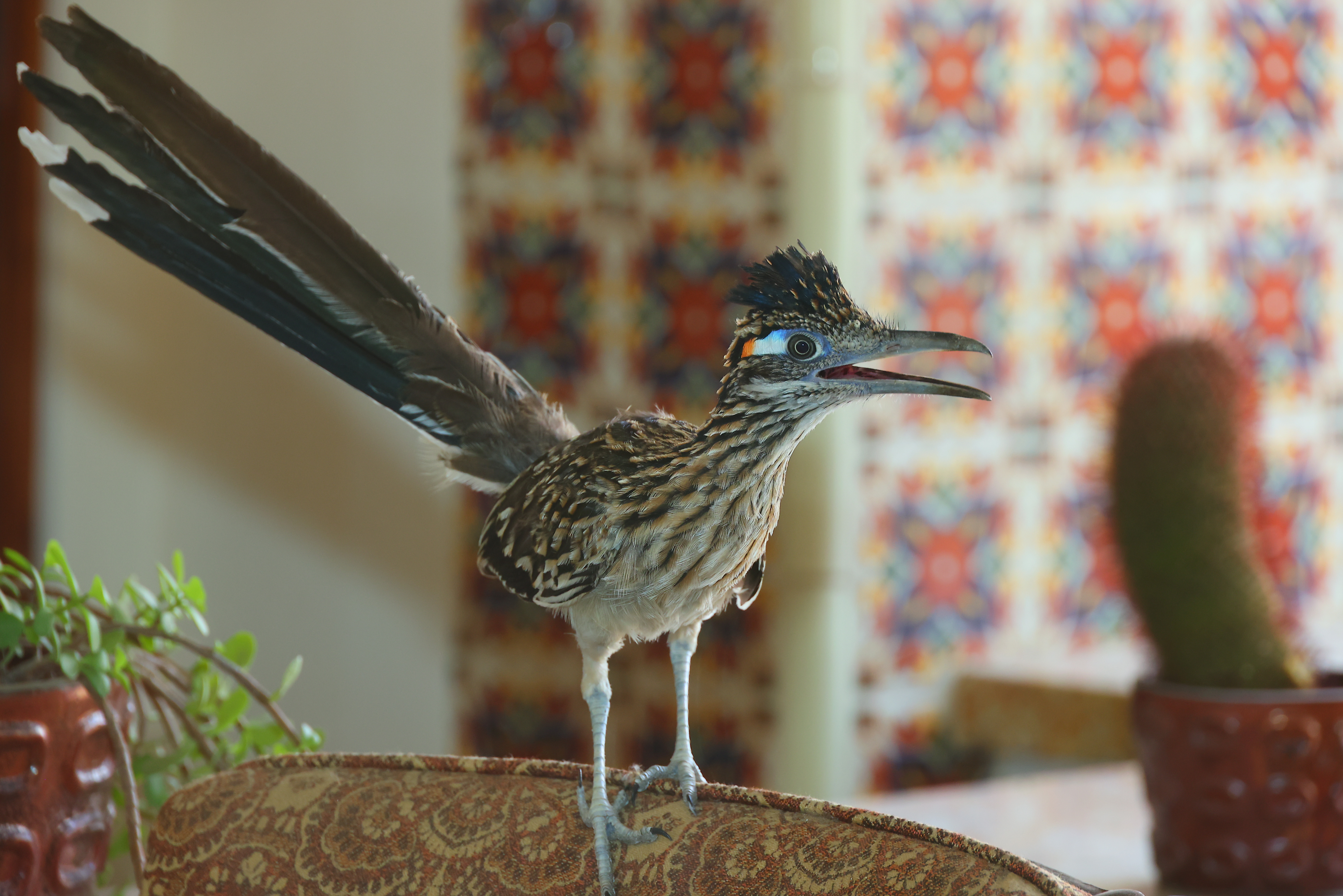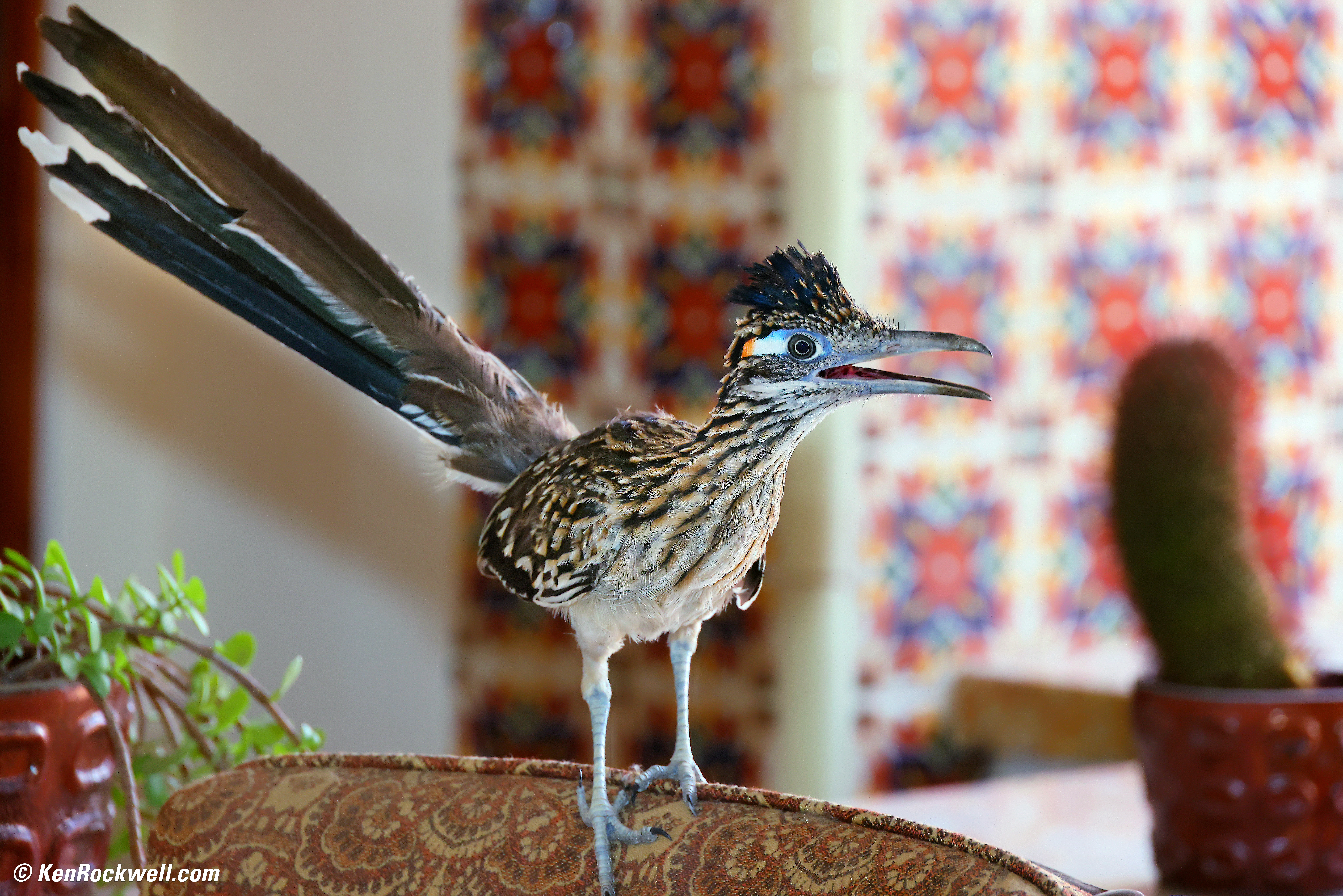 Sage Place, 6:03 PM, 07 August 2020. Canon EOS R5, Canon RF 24-240mm IS at 24mm at f/6.3 at 1/125 at Auto ISO 100 (LV 12.4), Perfectly Clear. bigger, full 45MP resolution or camera-original © JPG file. Not everything's in perfect focus, so no, not everything is perfectly sharp. The EOS R5 is superb for tracking motion and wildlife, and the 24-240mm has super-fast autofocus. This roadrunner was running all over, and my R5 just tracked and kept his eyes in focus all by itself with no need for me to move any focus points. It just found the eyes, grabbed them and tracked them as he jumped all over: Visiting Roadrunner (shot through window), 10:55 AM, 13 August 2020. Canon EOS R5, Canon RF 24-240mm IS at 183mm at f/7.1 at 1/200 at Auto ISO 1,600 (LV 9¼), Canon 580 EX II flash, Perfectly Clear. bigger, full 45MP resolution or camera-original © JPG file. Sharp? 1,200×900 pixel (6.8× magnification) crop from above. bigger, full 45MP resolution or camera-original © JPG file. If this 1,200 × 900 pixel crop is about 3" (7.5cm) wide on your screen, the complete image would print at a large 14 × 21″ (35 × 55 cm) at this same high magnification. If this 1,200 × 900 pixel crop is about 6" (15cm) wide on your screen, the complete image would print at a huge 27½ × 41¼″ (2¼ × 3½ feet or 70 × 105 cm) at this same high magnification. If this 1,200 × 900 pixel crop is about 12" (30cm) wide on your screen, the complete image would print at a mammoth 55 × 82½″ (4½ × 7 feet or 1.4 × 2.1 meters) at this same extremely high magnification!