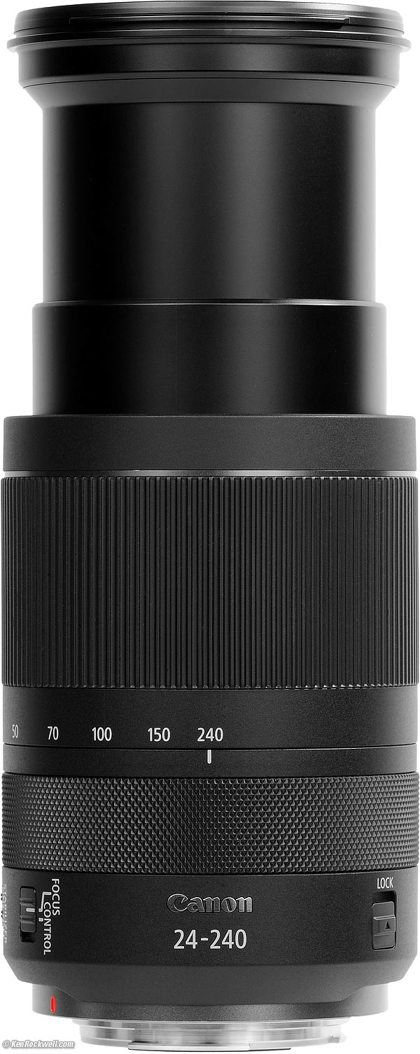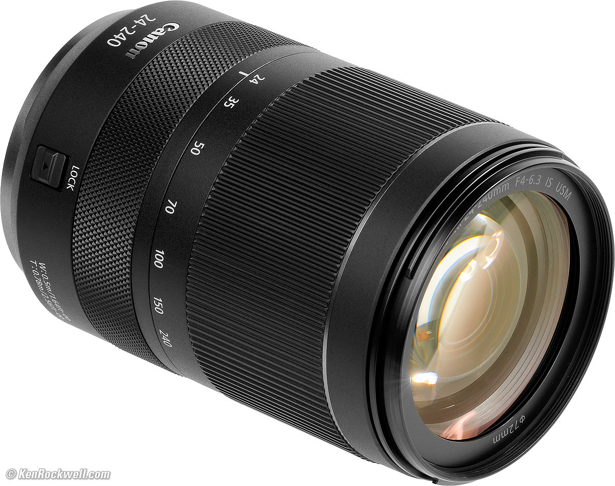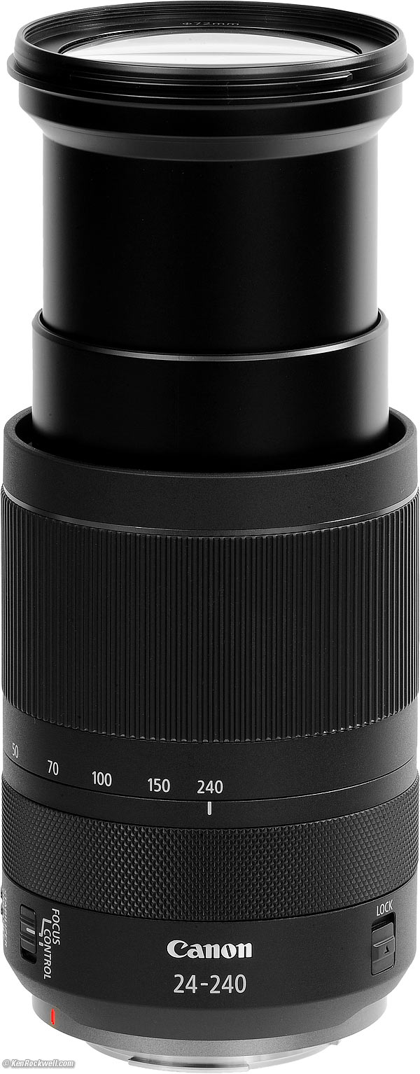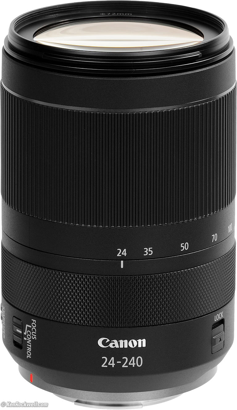 Recommendations topSample Images Intro Compatibility User's Guide Compared Recommendations I got my RF 24-240mm at B&H. I'd also get mine at Adorama, at Amazon or at Crutchfield, or used at eBay if you know How to Win at eBay. This lens does everything, and does it much better than anyone expects. It's optically superb, believe it or not. It's not 1973 anymore; Canon's and Nikon's wide-range zooms are super sharp and reasonably priced and focus very close; they're inexpensive because they aren't built to withstand as much physical abuse or are f/2.8. If you want sharpness, they're as good for all reasonable intents and purposes. I use a clear (UV) protective filter instead of a cap so I'm always ready to shoot instantly. I only use a cap when I throw this in a bag with other gear without padding — which is never. The UV filter never gets in the way, and never gets lost, either. The very best protective filter is the 72mm Hoya multicoated HD3 UV which uses hardened glass and repels dirt and fingerprints. For less money, the B+W 72mm 010 is an excellent filter, as are the multicoated version and the basic multicoated Hoya filters, but the Hoya HD3 is the toughest and the best. Filters last a lifetime, so you may as well get the best. The Hoya HD3 stays cleaner than the others since it repels oil and dirt. All these filters are just as sharp and take the same pictures, the difference is how much abuse they'll take and stay clean and stay in one piece. This all-content and junk-free website's biggest source of support is when you use those or any of these links to approved sources when you get anything, regardless of the country in which you live. Canon does not seal its boxes in any way, so never buy at retail or any other source not on my personally approved list since you'll have no way of knowing if you're missing accessories, getting a defective, damaged, returned, non-USA, store demo or used lens. I use the stores I do because they ship from secure remote warehouses where no one gets to touch your new camera before you do. Buy only from the approved sources I use myself for the best prices, service, return policies and selection. Thanks for helping me help you! Ken Rockwell.