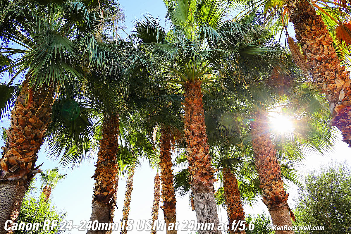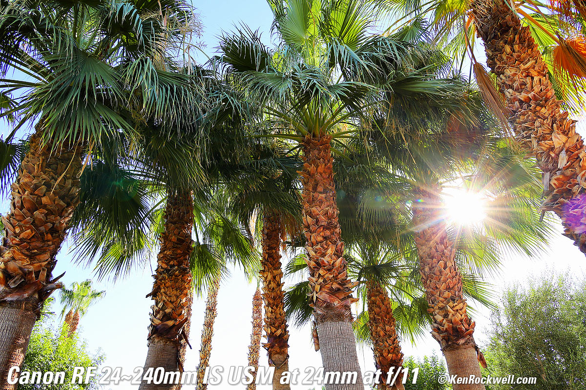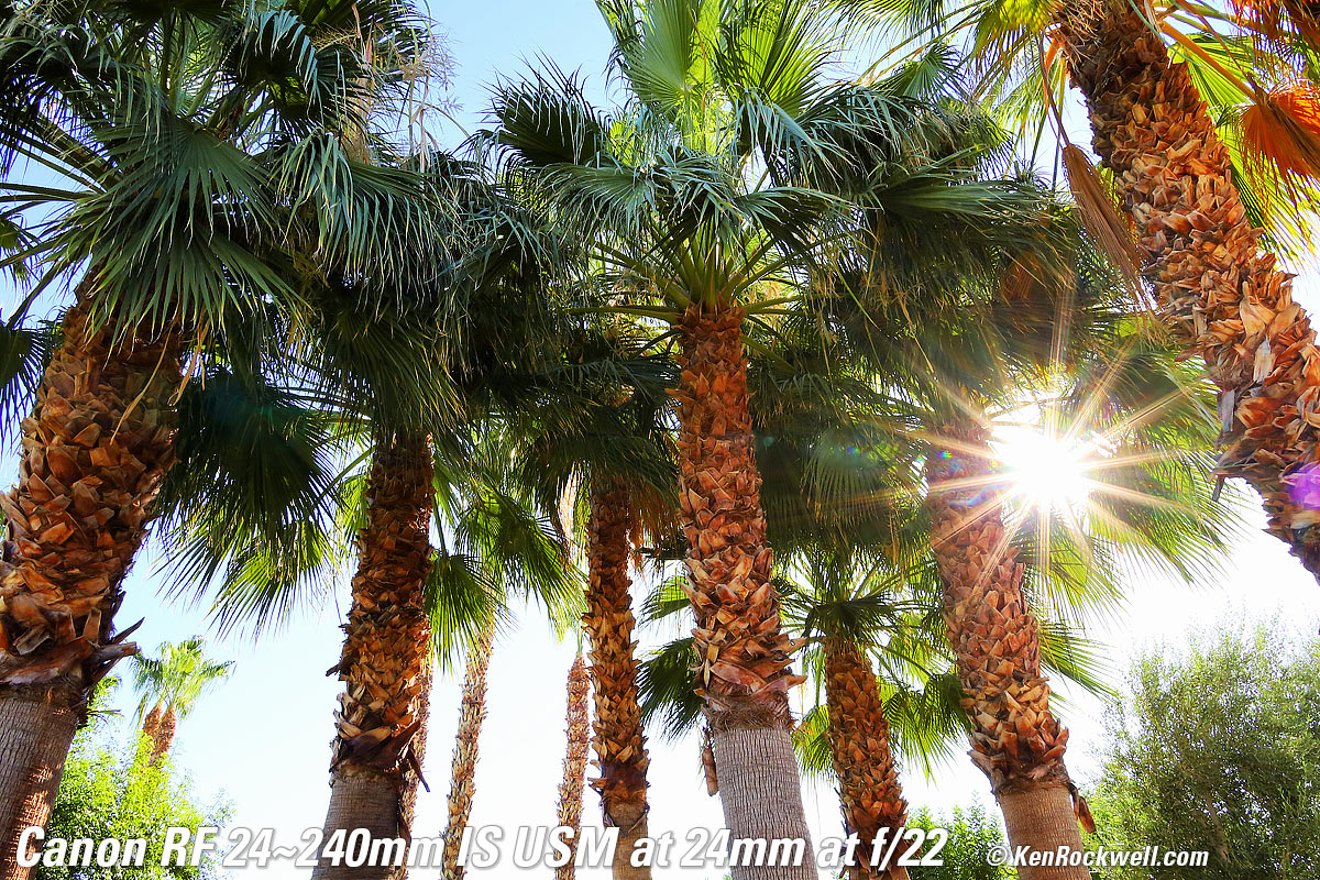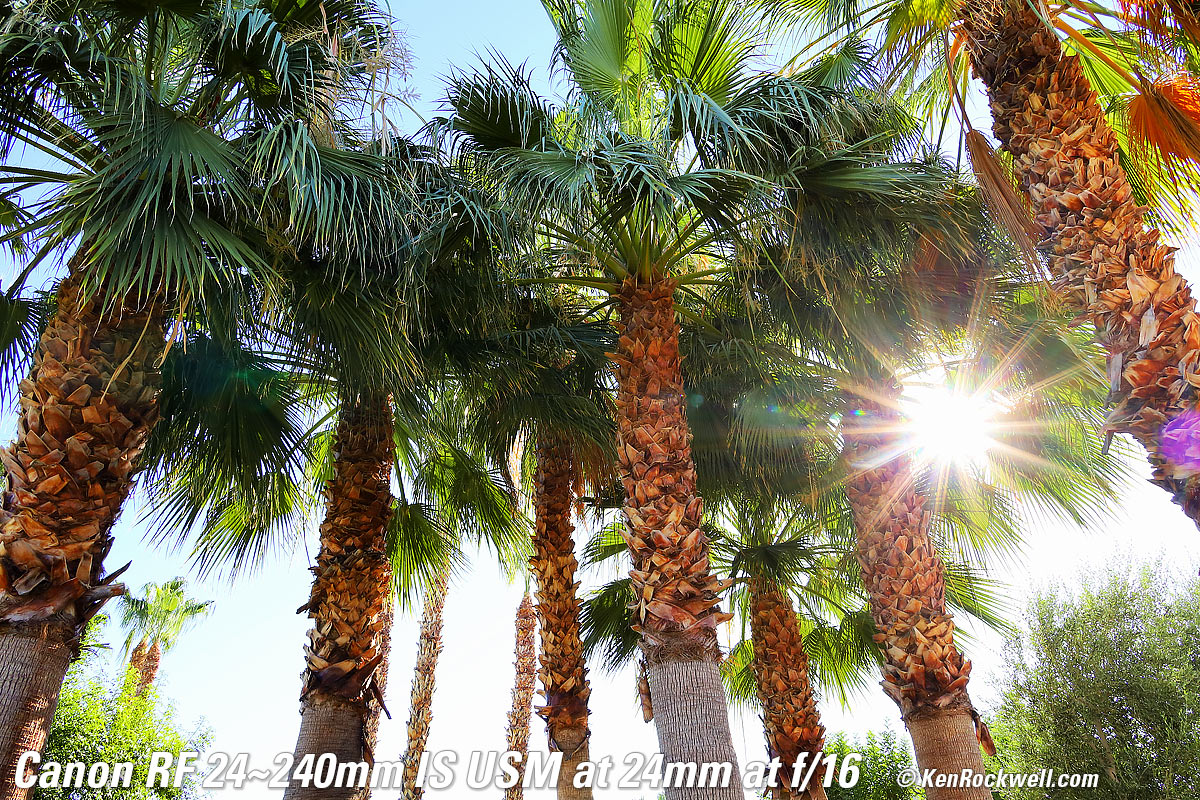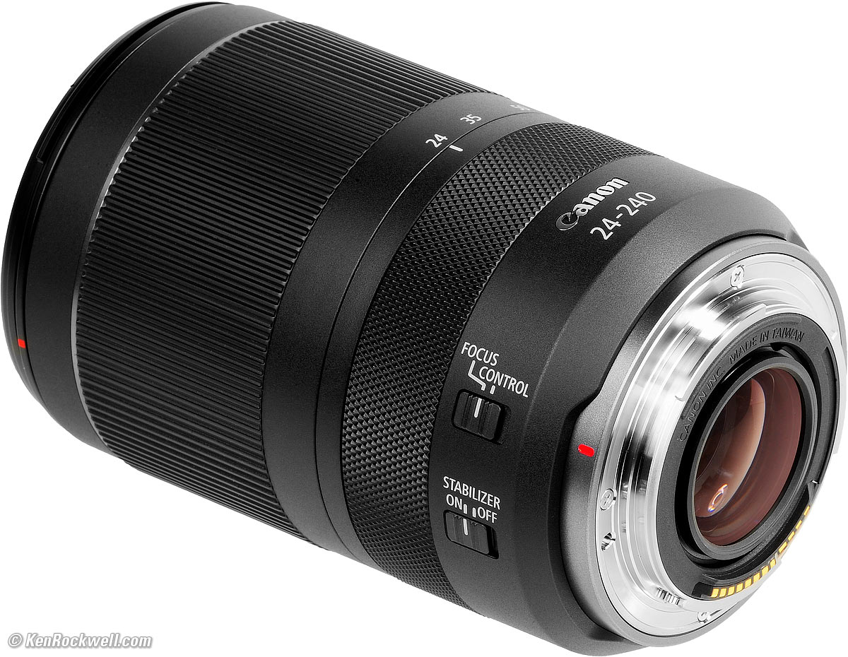 Recommendations topSample Images Intro Compatibility User's Guide Compared Recommendations I got my RF 24-240mm at B&H. I'd also get mine at Adorama, at Amazon or at Crutchfield, or used at eBay if you know How to Win at eBay. This lens does everything, and does it much better than anyone expects. It's optically superb, believe it or not. It's not 1973 anymore; Canon's and Nikon's wide-range zooms are super sharp and reasonably priced and focus very close; they're inexpensive because they aren't built to withstand as much physical abuse or are f/2.8. If you want sharpness, they're as good for all reasonable intents and purposes. I use a clear (UV) protective filter instead of a cap so I'm always ready to shoot instantly. I only use a cap when I throw this in a bag with other gear without padding — which is never. The UV filter never gets in the way, and never gets lost, either. The very best protective filter is the 72mm Hoya multicoated HD3 UV which uses hardened glass and repels dirt and fingerprints. For less money, the B+W 72mm 010 is an excellent filter, as are the multicoated version and the basic multicoated Hoya filters, but the Hoya HD3 is the toughest and the best. Filters last a lifetime, so you may as well get the best. The Hoya HD3 stays cleaner than the others since it repels oil and dirt. All these filters are just as sharp and take the same pictures, the difference is how much abuse they'll take and stay clean and stay in one piece. This all-content and junk-free website's biggest source of support is when you use those or any of these links to approved sources when you get anything, regardless of the country in which you live. Canon does not seal its boxes in any way, so never buy at retail or any other source not on my personally approved list since you'll have no way of knowing if you're missing accessories, getting a defective, damaged, returned, non-USA, store demo or used lens. I use the stores I do because they ship from secure remote warehouses where no one gets to touch your new camera before you do. Buy only from the approved sources I use myself for the best prices, service, return policies and selection. Thanks for helping me help you! Ken Rockwell.