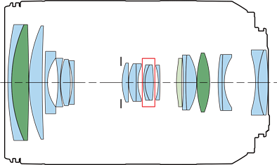Optics specifications topCanon RF 24-240mm internal optical construction. Aspherical and UD elements. IS section. 21 elements in 15 groups. One aspherical element. Two UD extra-low dispersion elements to help reduce secondary axial chromatic aberration. "Pumper" zoom: gets longer at 240mm.