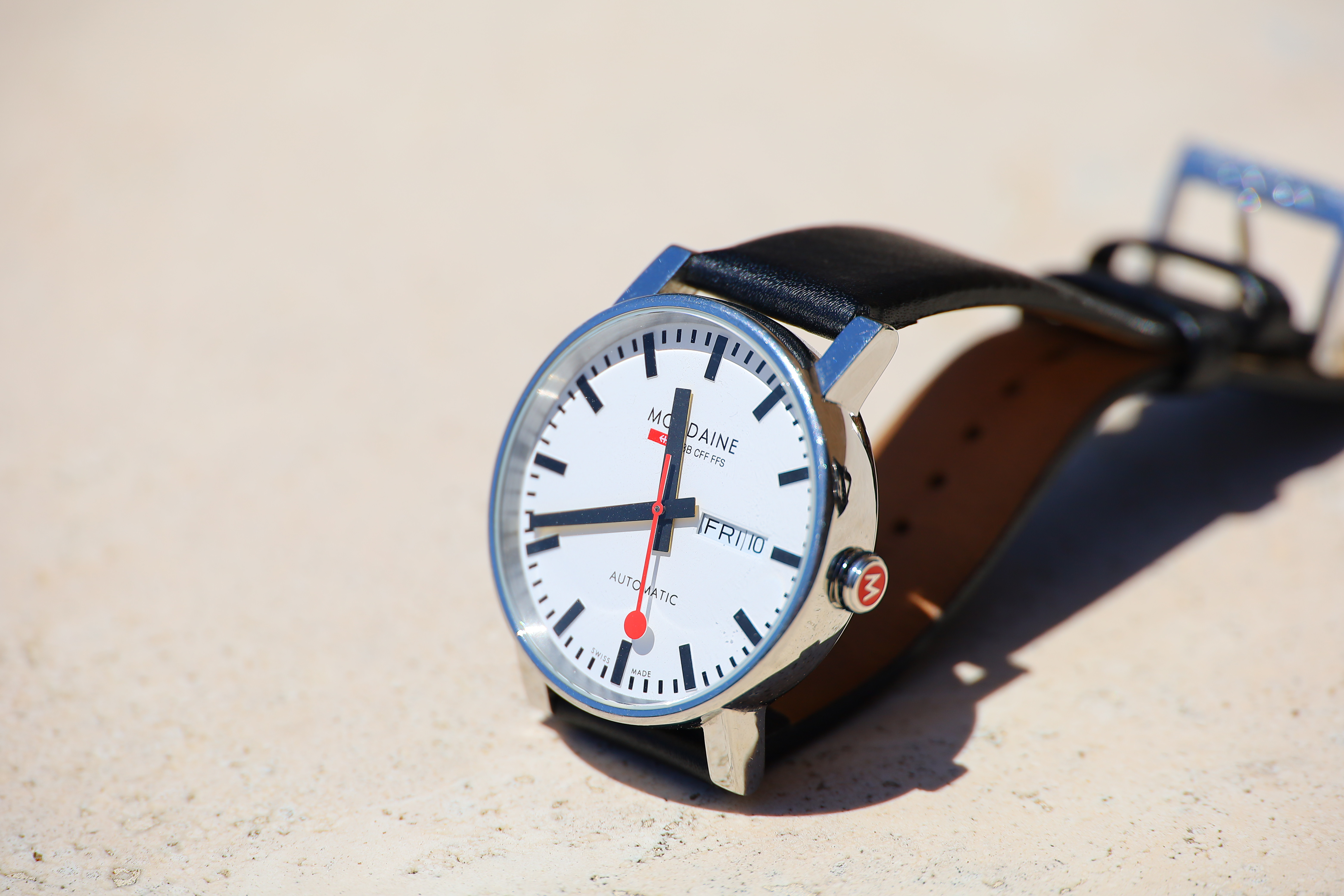 Spherochromatism performance topSpherochromatism, also called secondary spherical chromatic aberration or "color bokeh," is an advanced form of spherical and chromatic aberration in a different dimension than lateral chromatic aberration. It happens mostly in fast normal and tele lenses when spherical aberration at the ends of the color spectrum are corrected differently than in the middle of the spectrum. Spherochromatism can cause colored fringes on out-of-focus highlights, usually seen as green fringes on backgrounds and magenta fringes on foregrounds. Spherochromatism is common in fast lenses of moderate focal length when shooting contrasty items at full aperture. It goes away as stopped down. I see only the tiniest bit of warm/cool spherochromatism, which is as expected as it's so slow: Mondaine A132.30348.11SBB at close-focus distance wide-open at 240mm, 10 July 2020. bigger or camera-original © file.