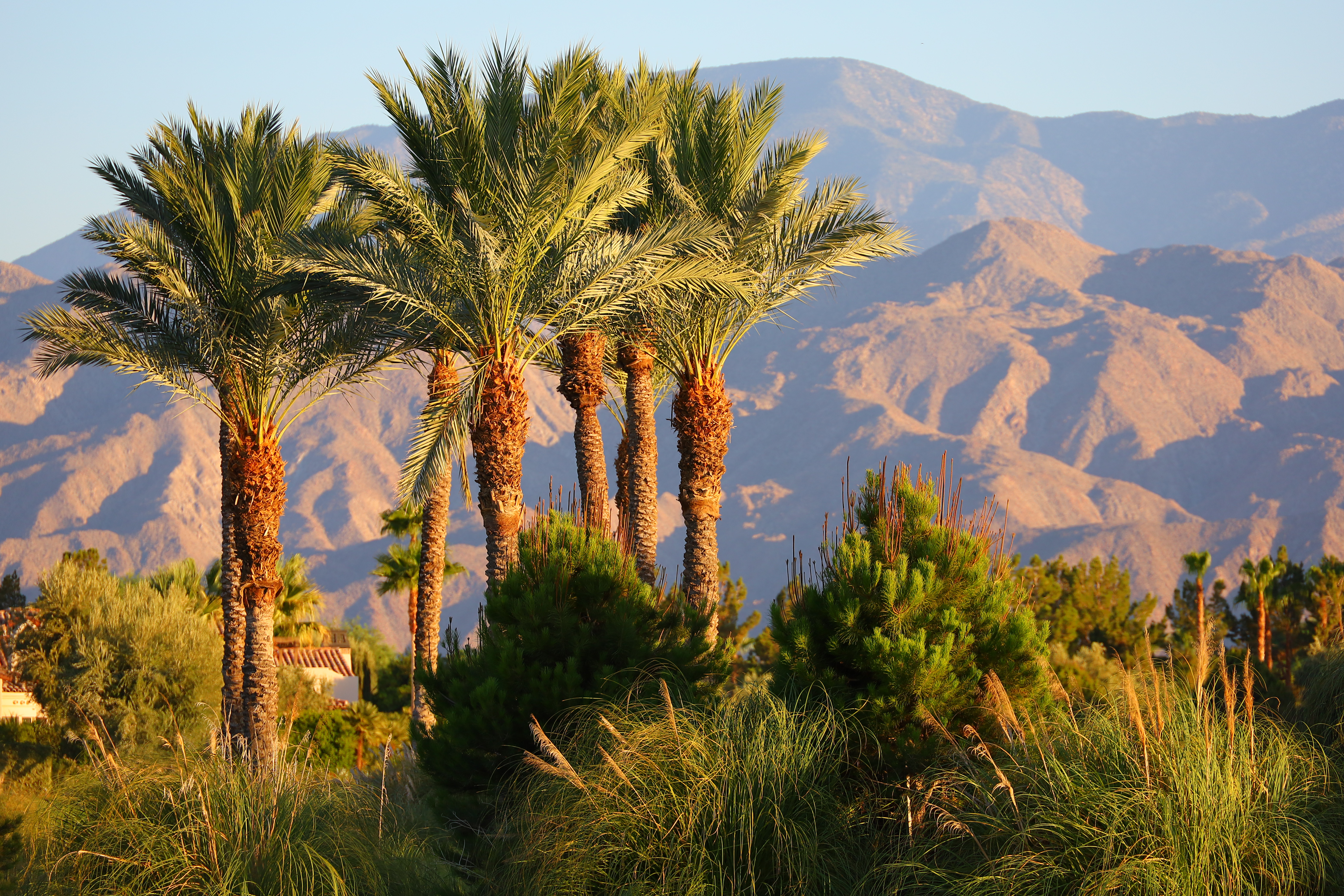 Palms and Desert Mountains at Dusk, 7:09 PM, 18 July 2020. Canon EOS RP, Canon RF 24-240mm at 222mm at f/6.3 at 1/250 at Auto ISO 100 (LV 12.4), exactly as shot. bigger or camera-original © JPG file. Sharp, even wide-open.