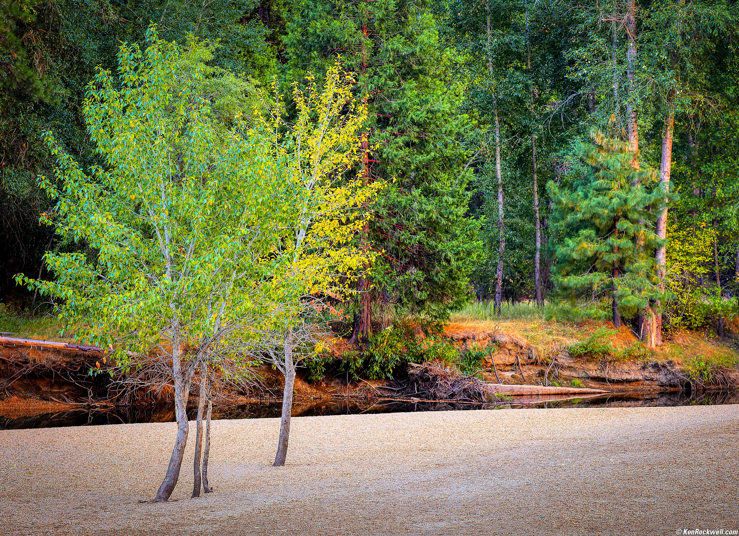 Ultra sharp hand-held at 1/8 of a second! Trees Along the Merced River, Yosemite National Park, 2:53 P.M., 15 October 2021. Canon EOS R5 in 4:5 crop mode, RF 24-240mm IS USM at 62mm (240mm equivalent on 4x5″ film) at f/8 hand-held at 1/8 at ISO 100, -0.7 stops exposure compensation (LV 9.0), 4:5 Perfectly Clear. bigger or fit-to-screen.