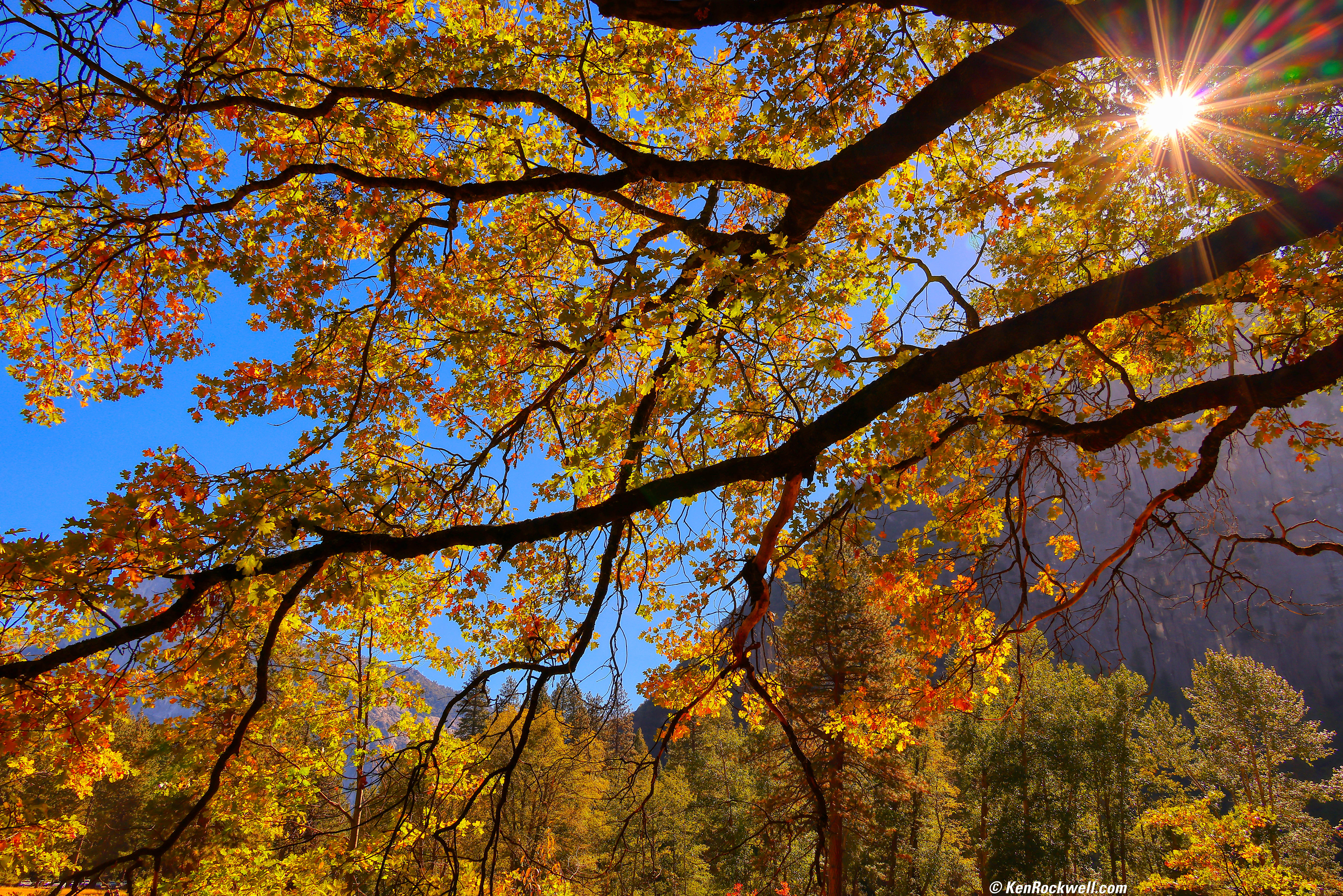 Morning in Cook's Meadow, Yosemite, 11:23 A.M., 15 October 2021. Canon EOS R5, RF 24-240mm IS USM at 24mm at f/16 (for a good sunstars) at 1/60 at ISO 100, -0.7 stops exposure compensation (LV 14.0), shade white balance to make leaves more orange, Skylum Aurora HDR from my one JPG image to make the leaves golden and awesome. bigger or fit-to-screen, or full 45 MP resolution JPG image (12 MB). Don't tell me the RF 24-240mm IS USM isn't ultra sharp!