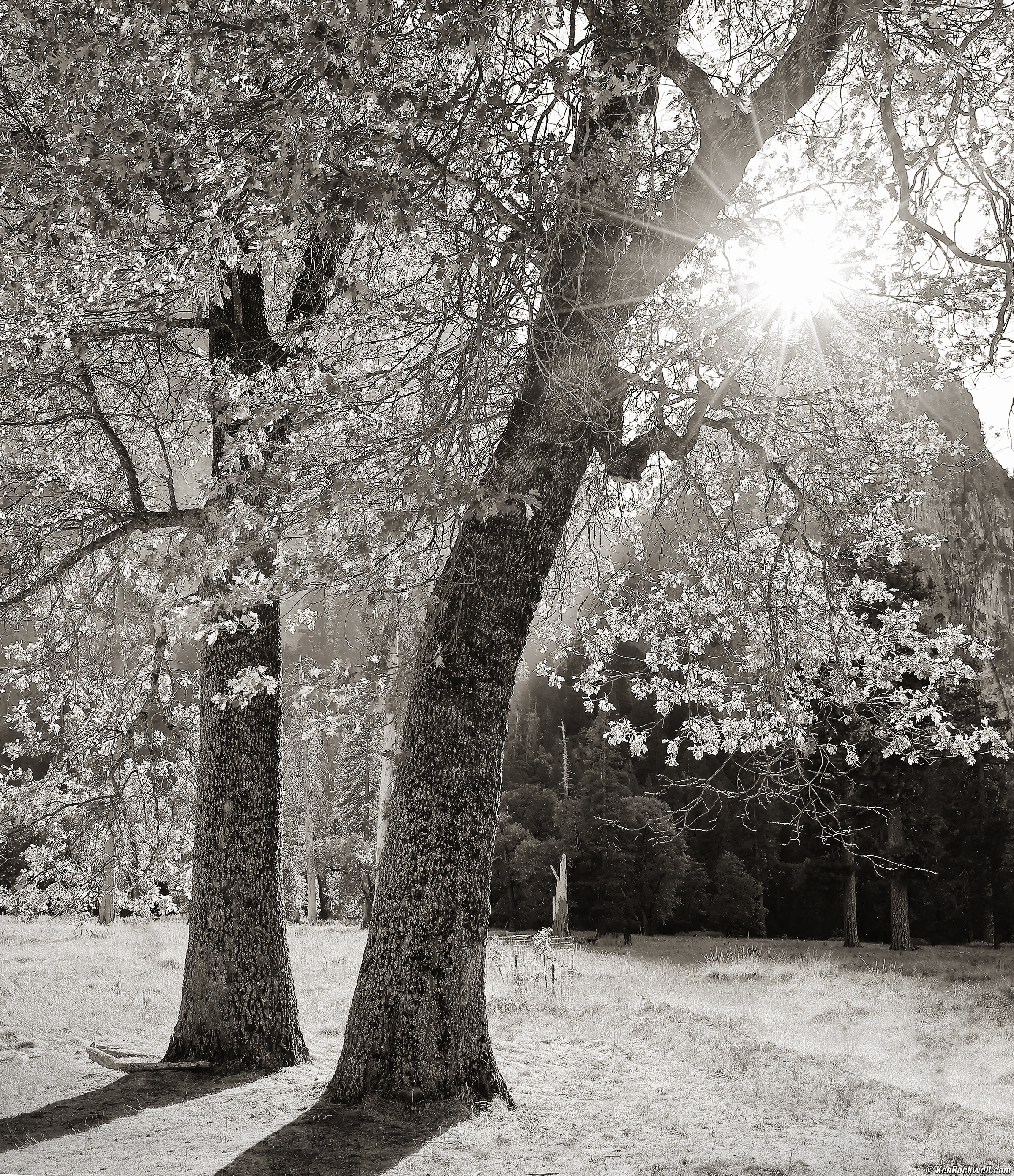Sun Trees, El Capitan Meadow, Yosemite National Park, 3:30 P.M., 15 October 2021. Canon EOS R5, RF 24-240mm IS USM at 24mm at f/11 at 1/50 at ISO 100 (LV 12.6), Perfectly Clear, split-toned print. bigger or fit-to-screen.