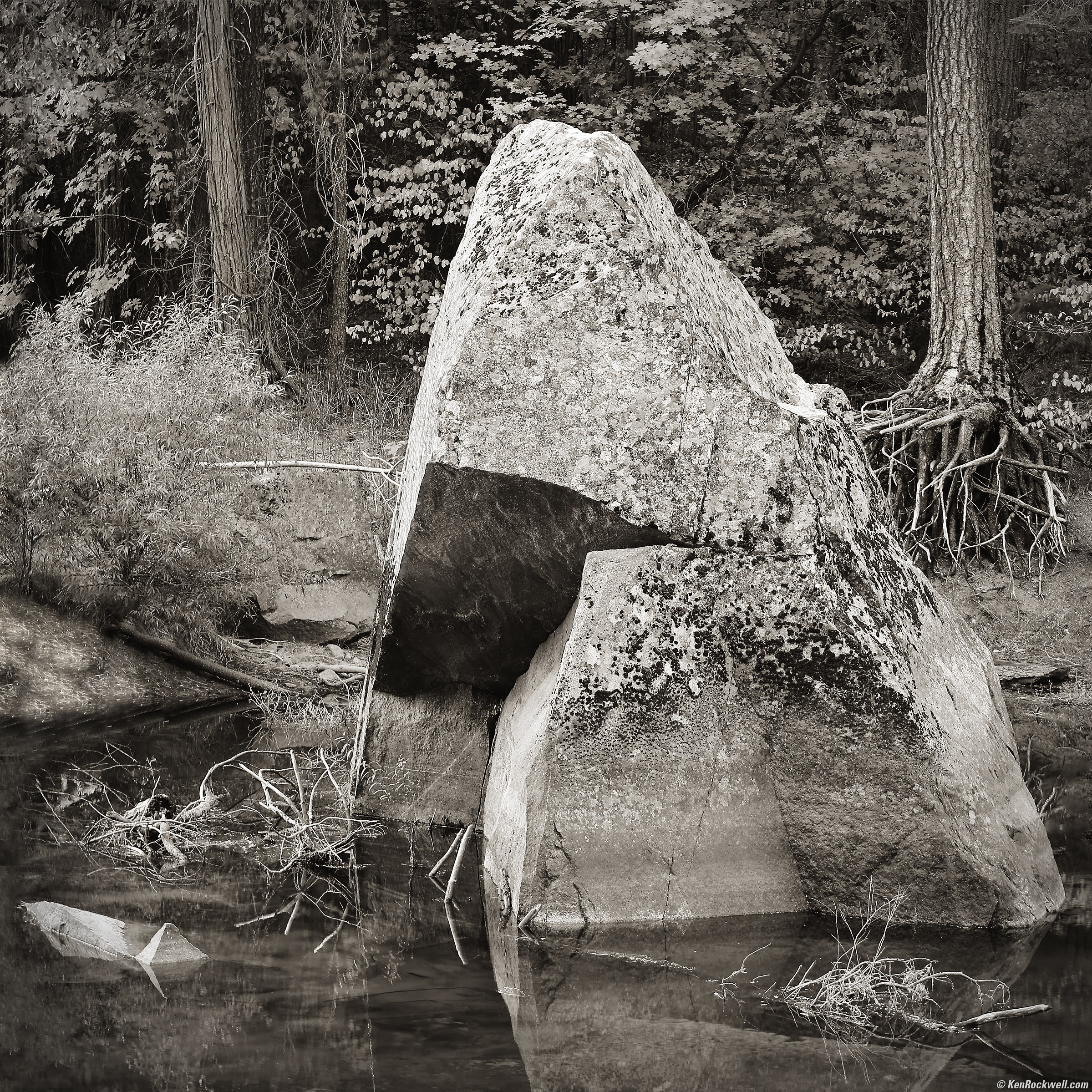 Stone Triangle in the Merced River, Yosemite National Park, 8:07 A.M., 17 October 2021. Canon EOS R5, RF 24-240mm IS USM at 70mm wide-open at f/5.6 hand-held at 1/13 second at ISO 200 (LV 7.6), square crop (150mm eq. on HASSELBLAD 6×6 cm), Perfectly Clear, split-toned print. bigger or fit-to-screen.