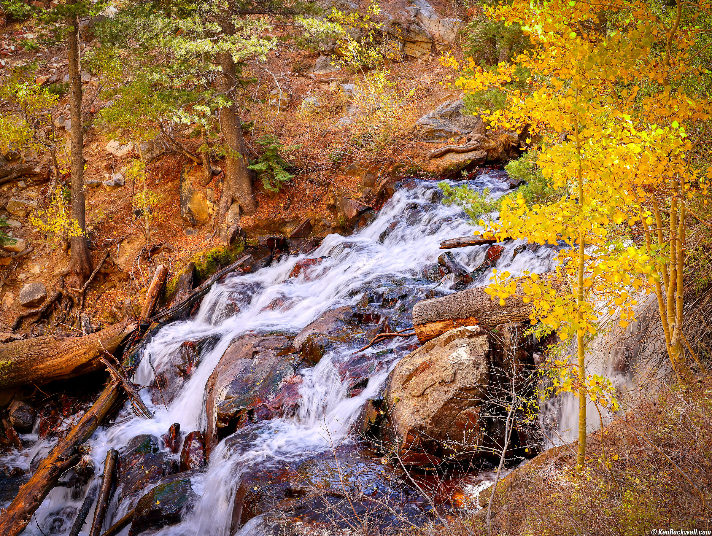 The great stabilization lets me shoot hand-held at slow shutter speeds perfect for moving water. I love not needing my tripod! Lee Vining Creek Falls, 3:12 P.M., 17 October 2021. Canon EOS R5, RF 24-240mm IS USM at 50mm cropped to 4:5 (300mm equivalent on 4x5″ film) at f/8 hand-held at 1/25 second at ISO 100 (LV 10.6), cloudy in-camera white balance to warm the image, negative flipped in Photoshop CS6 (2010) to make the creek flow more naturally from left to right, Skylum Aurora HDR to add vignetting and detail back into the whitewater, all from one JPG image from my R5. bigger or fit-to-screen.