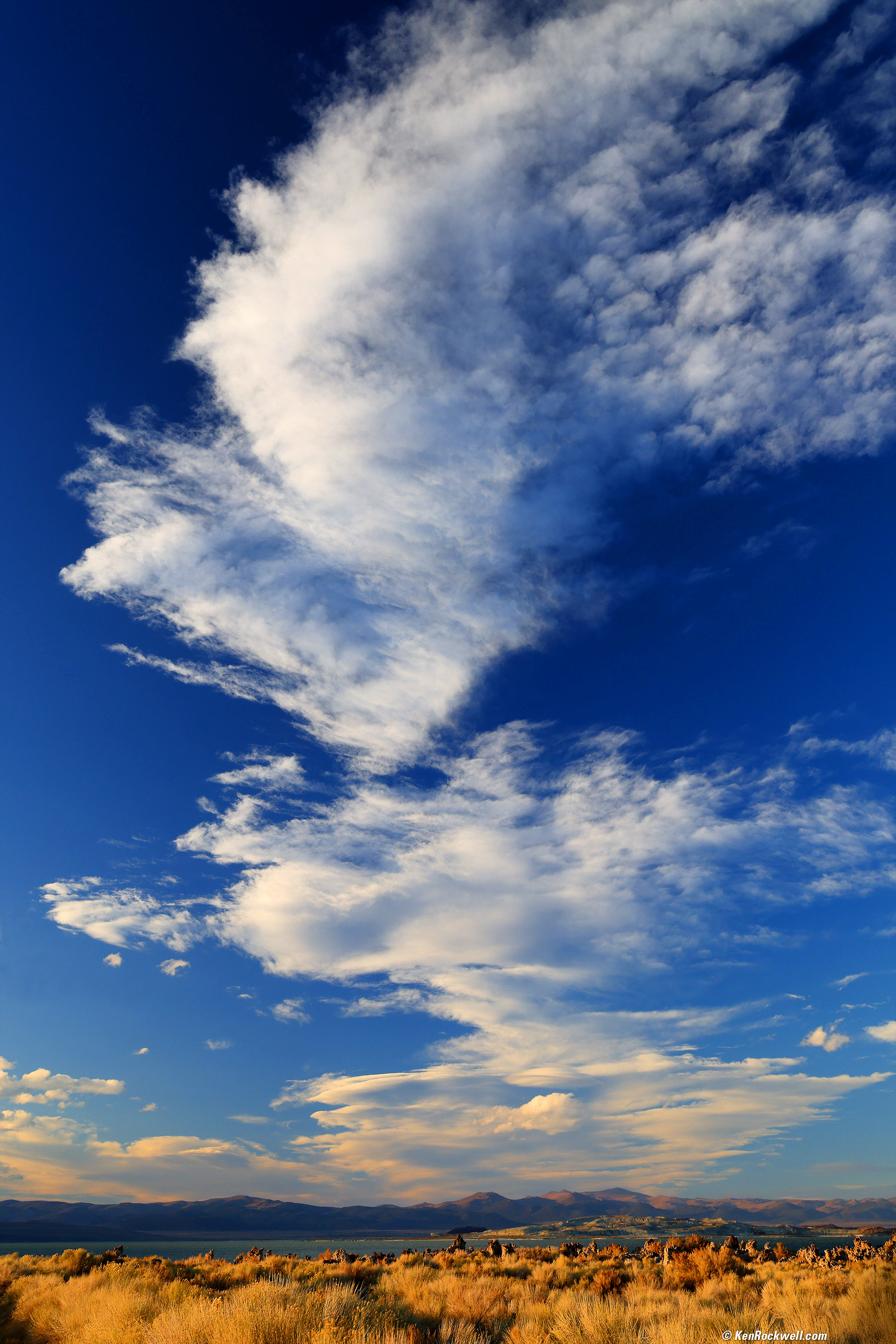 Clouds in the Shape of North America Above Mono Lake at Last Light, 5:40 P.M., 17 October 2021. Canon EOS R5, RF 24-240mm IS USM with Nikon Circular Polarizer II at 32mm at f/8 at 1/80 at Auto ISO 160 (LV 11.7), Perfectly Clear. bigger or fit-to-screen.