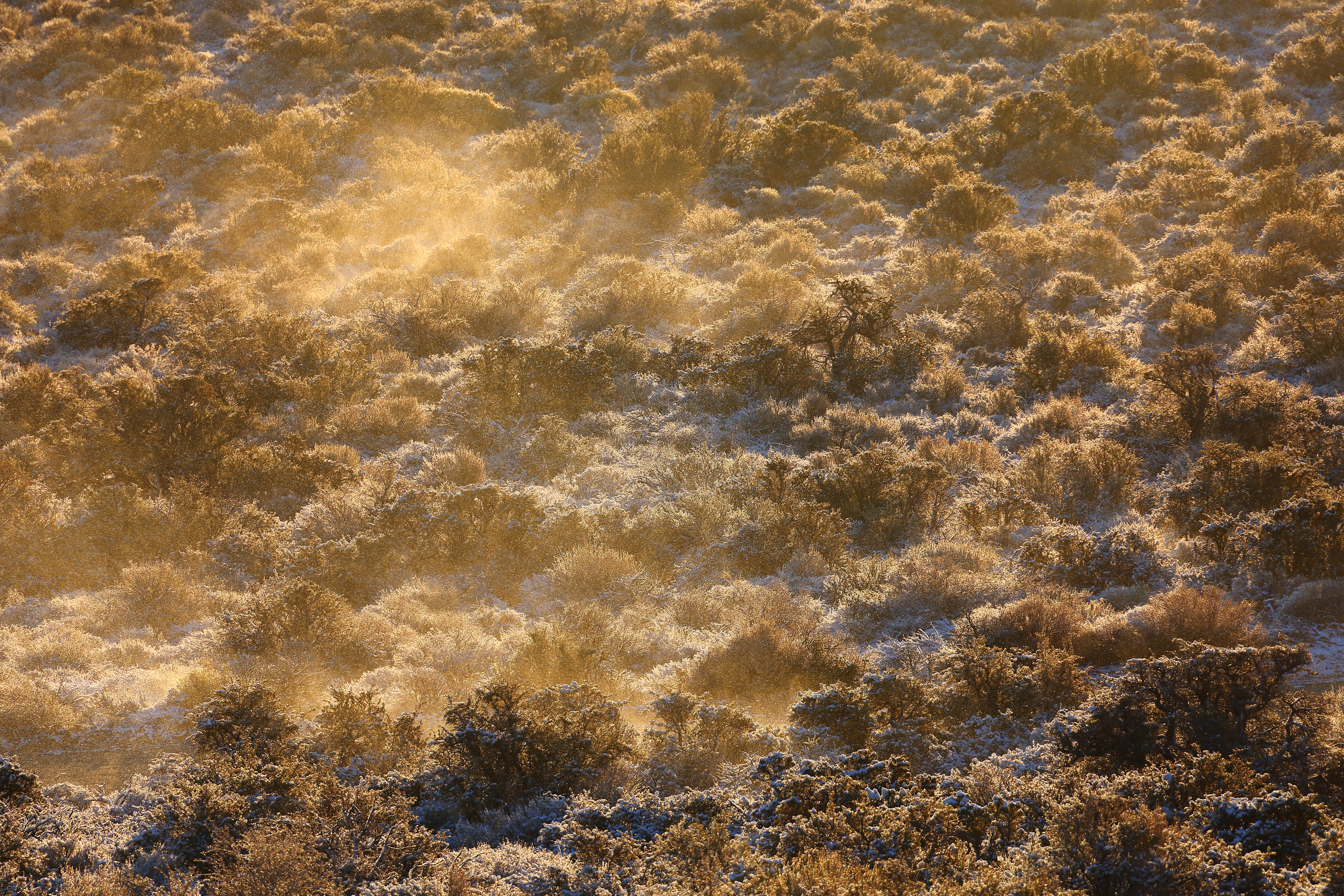 Blowing Backlit Snow, Mono Lake, 7:29 AM., 18 October 2021. Canon EOS R5, RF 24-240mm IS USM at 240mm at f/8 hand-held at 1/125 at ISO 100 (LV 13.0), unsharpened and as shot, with a mild crop. bigger or fit-to-screen or camera-original 45MP © 19 MB JPG. The 24-240mm is sharp corner-to corner, especially at 240mm where many zooms go soft. Remember the top and bottom aren't in perfect focus, but look at the blowing snowflakes in the top corners that are in focus and you can see every one.