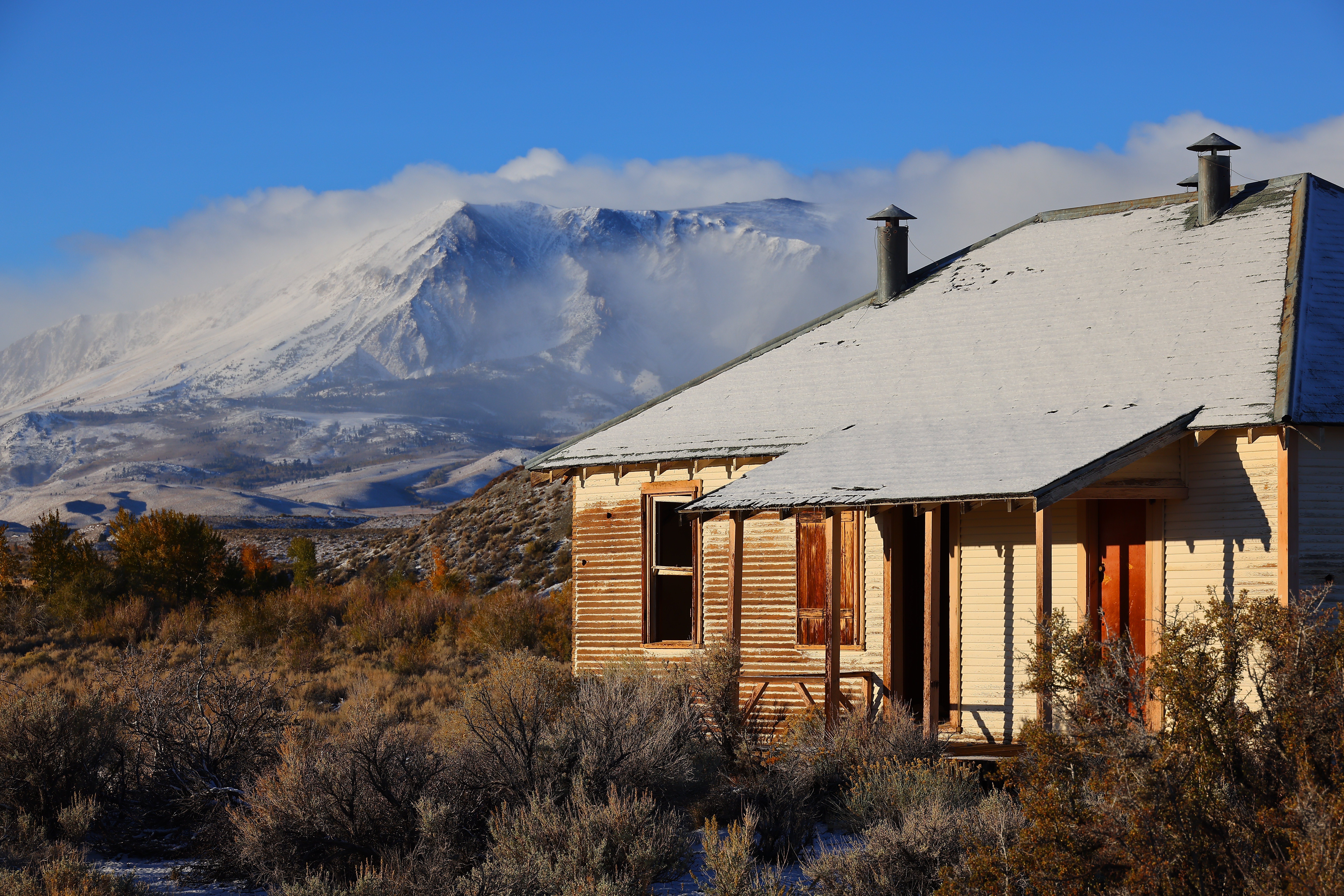Abandoned Shack with Snowy Mountains and Blowing Snow, Mono Lake, 8:01 AM., 18 October 2021. Canon EOS R5, RF 24-240mm IS USM at 100mm at f/11 at 1/320 at ISO 100, -0.7 stops exposure compensation (LV 15.4), Perfectly Clear. bigger or fit-to-screen or camera-original 45MP © 11 MB JPG.