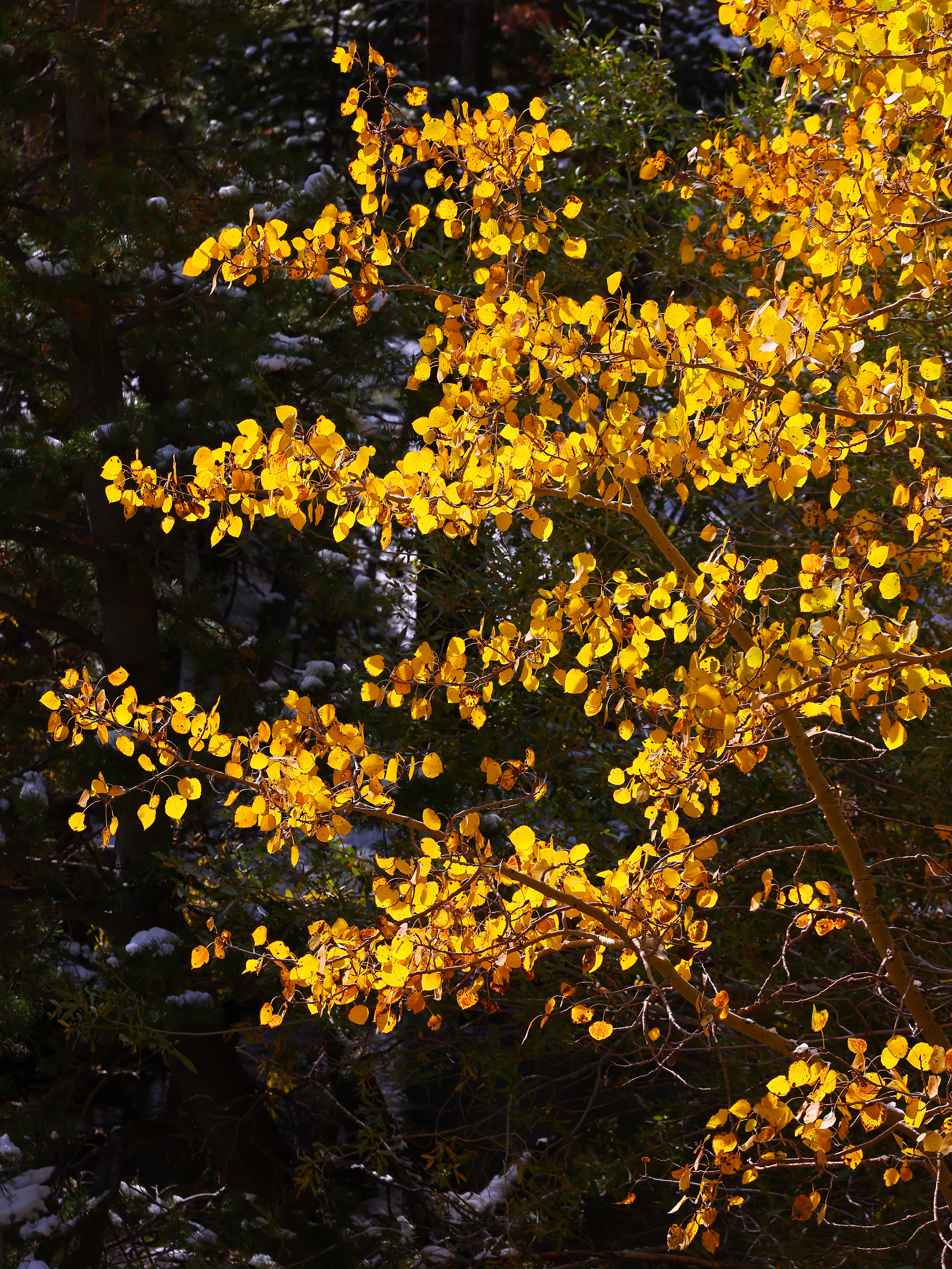 Golden Aspen, Tioga Pass Road, 12:49 P.M., 18 October 2021. Canon EOS R5 in 4:3 crop mode, RF 24-240mm IS USM at 150mm at f/11 at 1/100 at Auto ISO 100, -0.7 stops exposure compensation (LV 13.6), Skylum Aurora HDR to add detail to the bright orange leaves and bring up the dark green shadows from my single JPG shot. bigger or fit-to-screen or camera-original 45 MP © 9 MB JPG.