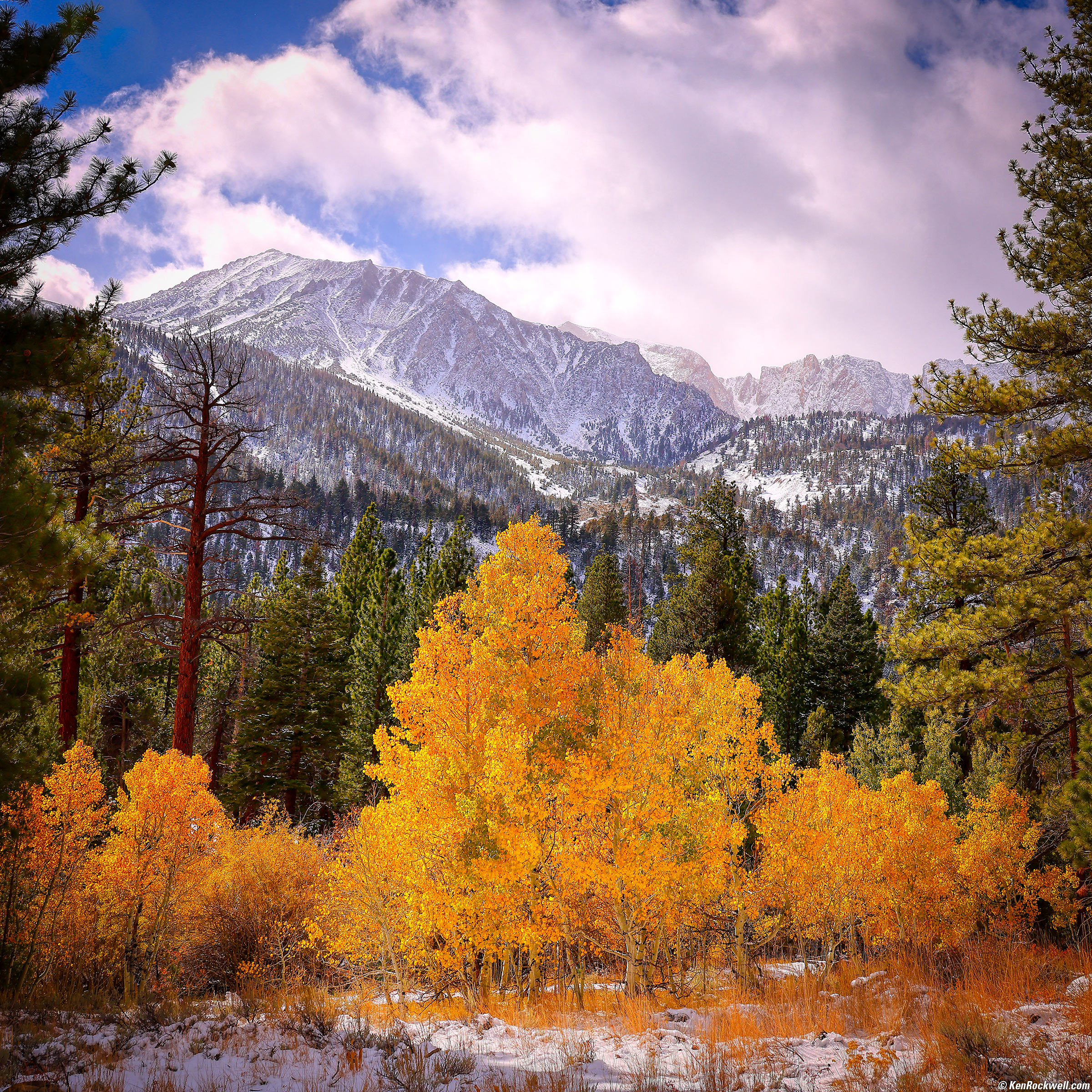 Golden Aspens and Snow-Covered Mountains, Tioga Pass Road, 1:21 P.M., 18 October 2021. Canon EOS R5, RF 24-240mm IS USM at 34mm in square crop mode (80mm eq. on HASSELBLAD 6×6 cm) at f/8 at 1/640 at Auto ISO 100, -0.7 stops exposure compensation (LV 15.4), Skylum Aurora HDR to make it magical from my single JPG shot whose background was a lot lighter than the trees. bigger or fit-to-screen.