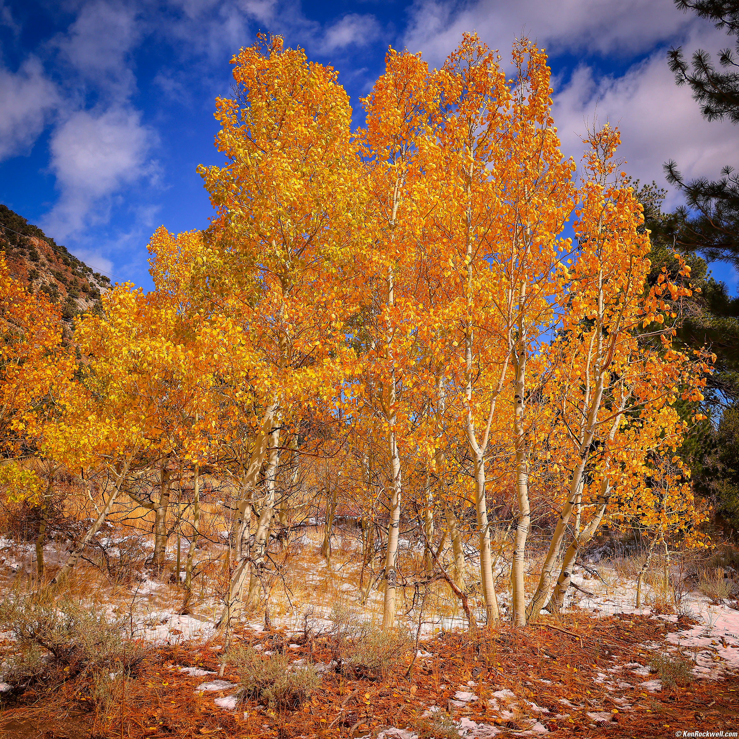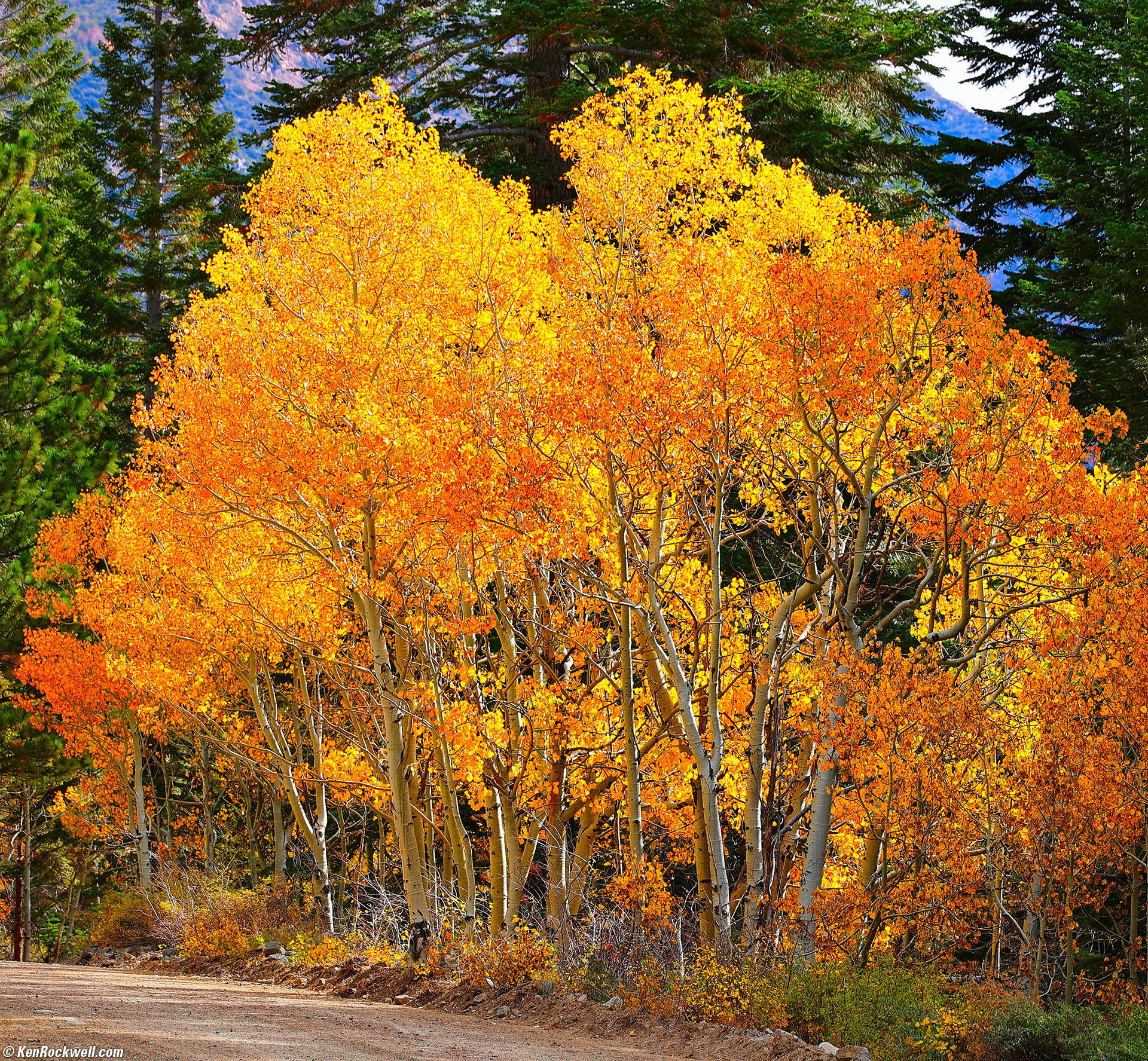 Aspens Aflame, Poole Power Plant Road, Lee Vining, California, 10:59 A.M., 18 October 2022. Canon EOS R6, RF 24-240mm IS USM at 118mm, f/8 at 1/125 at Auto ISO 100, -1/3 stop exposure compensation (LV 13.0). More tech details. bigger or fit-to-screen.