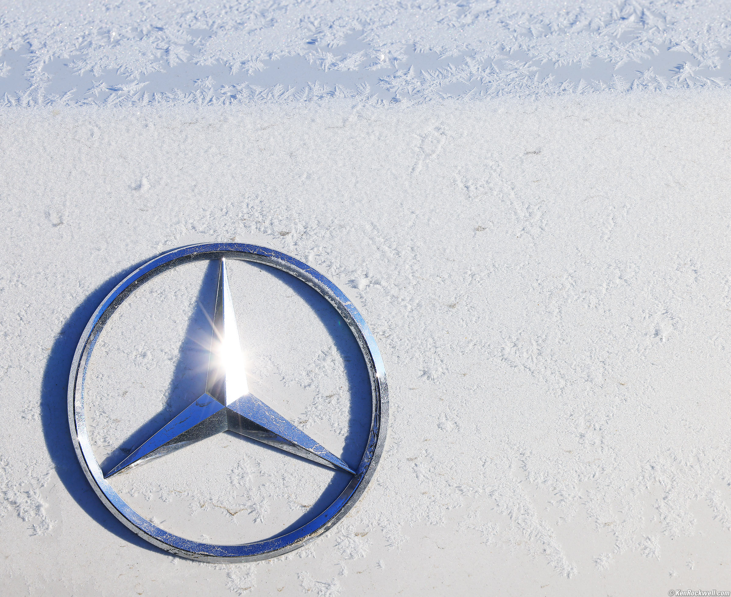 Star on the Star (alternately, Frozen Mercedes Star), 8:16 A.M., 19 October 2021. Canon EOS R5, RF 24-240mm IS USM at 100mm at f/11 at 1/160 at Auto ISO 100, +0.7 stops exposure compensation to keep the white car from going gray, (LV 14.4). bigger or fit-to-screen.