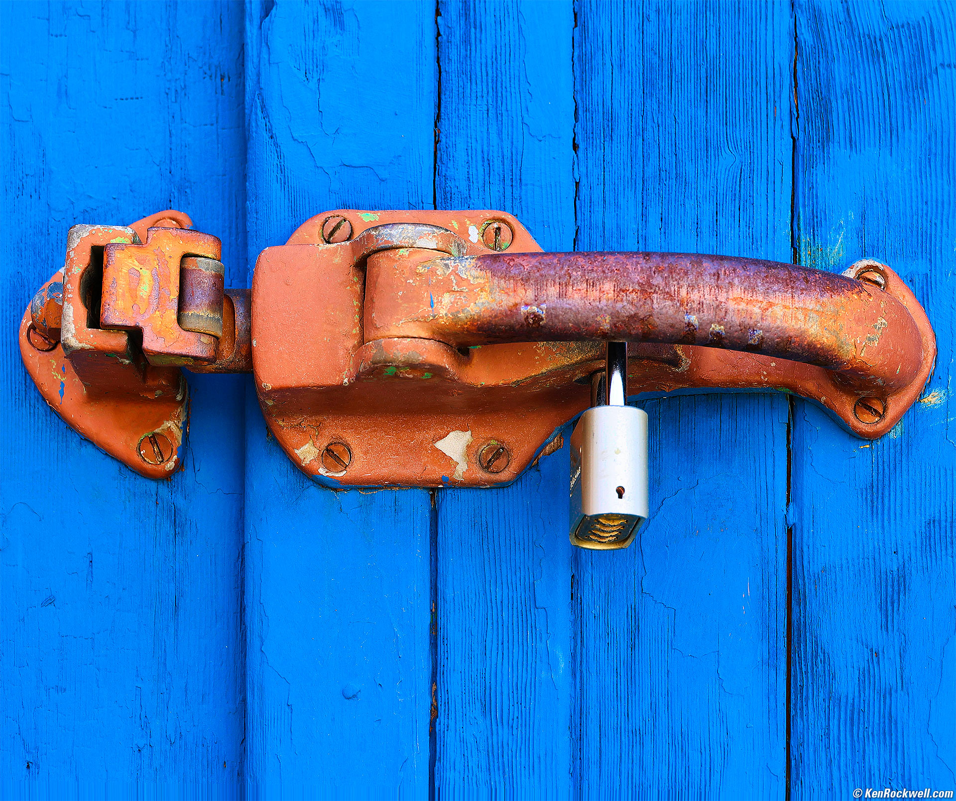 Orange Handle on Blue Door, Lee Vining, California, 1:24 P.M., 18 October 2022. Canon EOS R6, RF 24-240mm IS USM at 100mm, f/8 at 1/40 at Auto ISO 100, -1/3 stop exposure compensation (LV 13.4). More tech details. bigger or fit-to-screen. Part of the handle isn't that sharp because depth-of-field goes away at distances this close. If I was paying more attention as we walked around looking for lunch I'd have shot at f/16 at 1/10 instead, but tough.