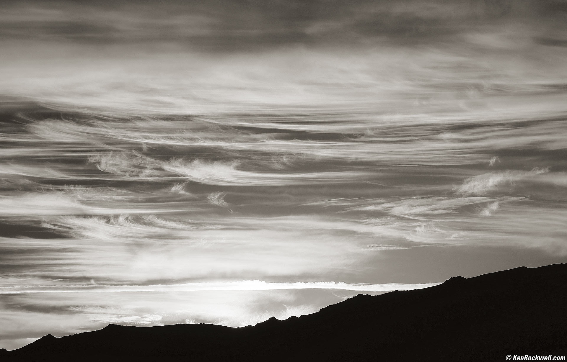 Whispy Dawn as seen from South Tufa, Mono Lake, California, 7:19 A.M., 19 October 2022. Canon EOS R6, RF 24-240mm IS USM at 240mm, f/14 at 1/1,250 at Auto ISO 200, -2/3 stops exposure compensation (LV 17.0), split-toned print. More tech details. bigger or fit-to-screen. I used Skylum Luminar Neo to control the highlights, shadows and tones, and then split-toned the print. I didn't need any Channel Mixer hijinx here because the subject, and thus the original color image, was monochrome: it was all white, shades of orange, and black. I show it in monochrome here because color adds nothing to the photo; it's all about the whispy shapes of the clouds as well as highlights and shadows; nothing to do with color. If any element, like color or a stray beer can, doesn't add to your piece, take it out. I can't recall why this is at ISO 200; for all I know I may have set my EOS R6 to Highlight Tone Priority to retain detail in the extreme pointed-at-the-sun highlights, and Highlight Tone Priority has a lowest ISO of 200.