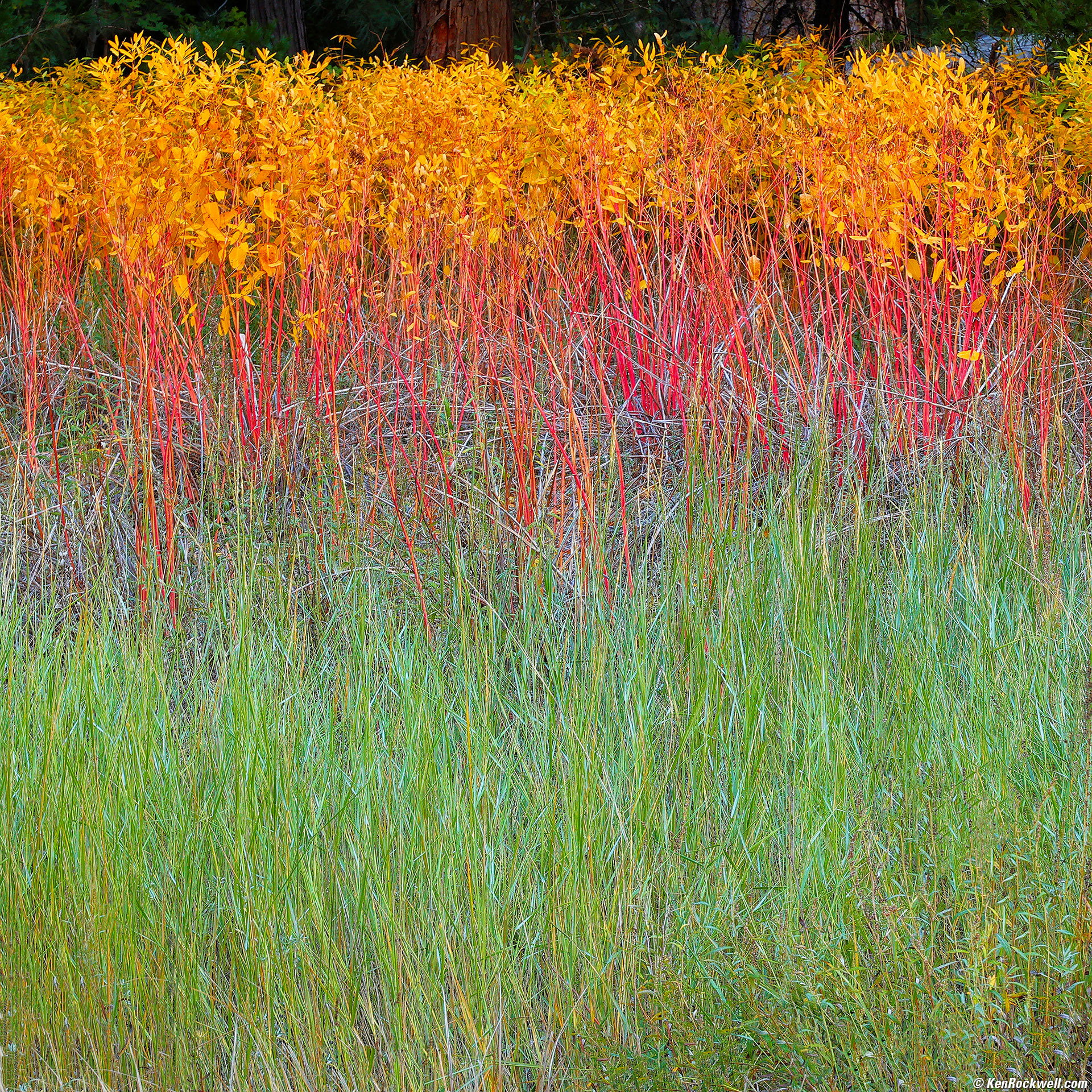 Chromatic Grass, Sentinel Meadow Just South of the Chapel, Yosemite National Park, California, 11:45 A.M., 21 October 2022. Canon EOS R6 in square crop mode, RF 24-240mm IS USM at 109mm (equivalent to the ZEISS 250mm f/5.6 SONNAR lens on HASSELBLAD 6×6), f/20 hand-held at 1/8 second at ISO 200, -1/3 stop exposure compensation (LV 10.6). More tech details. bigger or fit-to-screen.