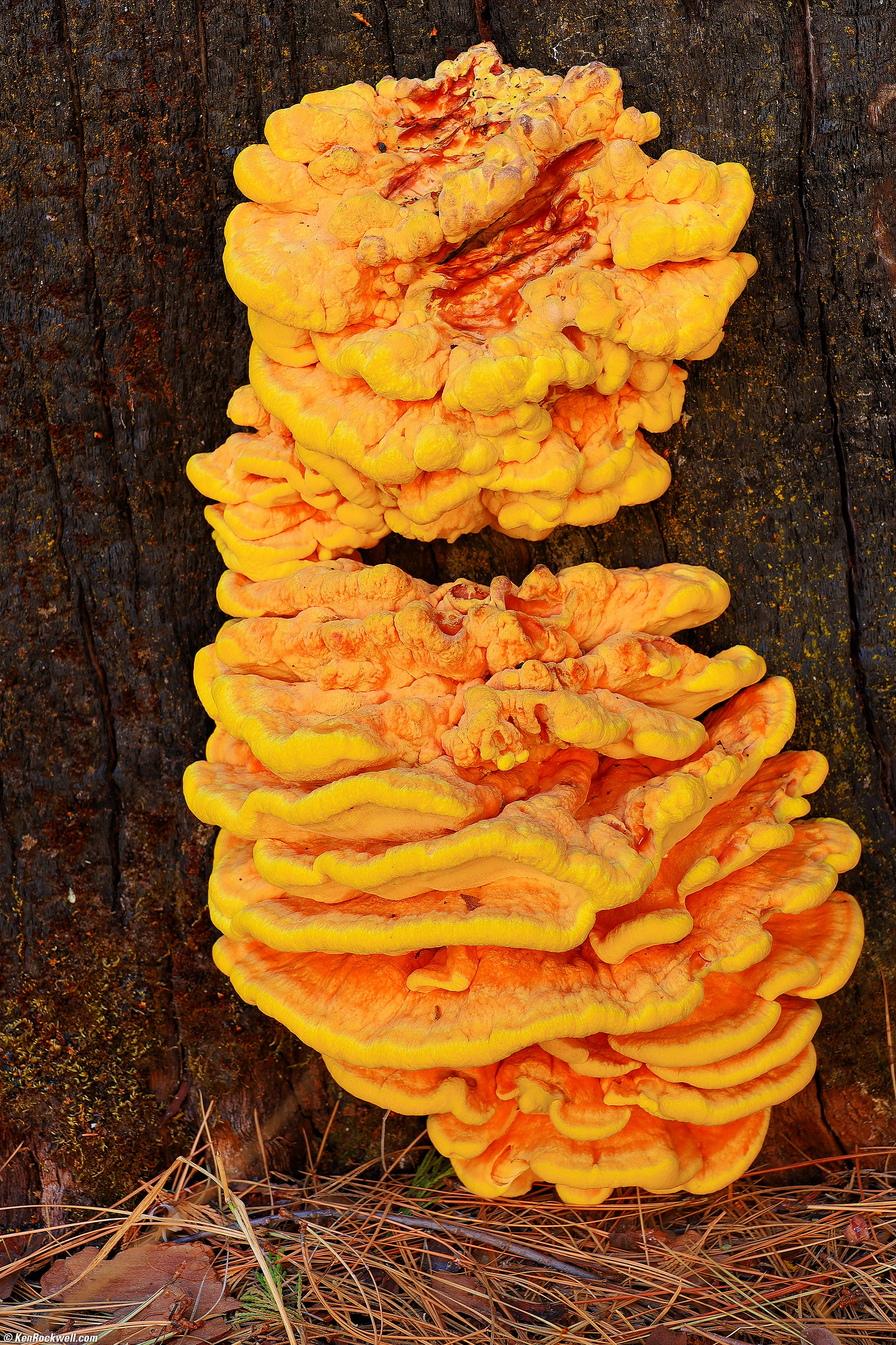Gigantic "Chicken of the Forest" (Laetiporus sulphureus) fungus, El Capitan Meadow, Yosemite National Park, California, 3:28 P.M., 21 October 2022. Canon EOS R6, RF 24-240mm IS USM at 70mm, f/8 hand-held at 1/15 at Auto ISO 100, -1/3 stop exposure compensation (LV 10.0). More tech details. bigger or fit-to-screen.