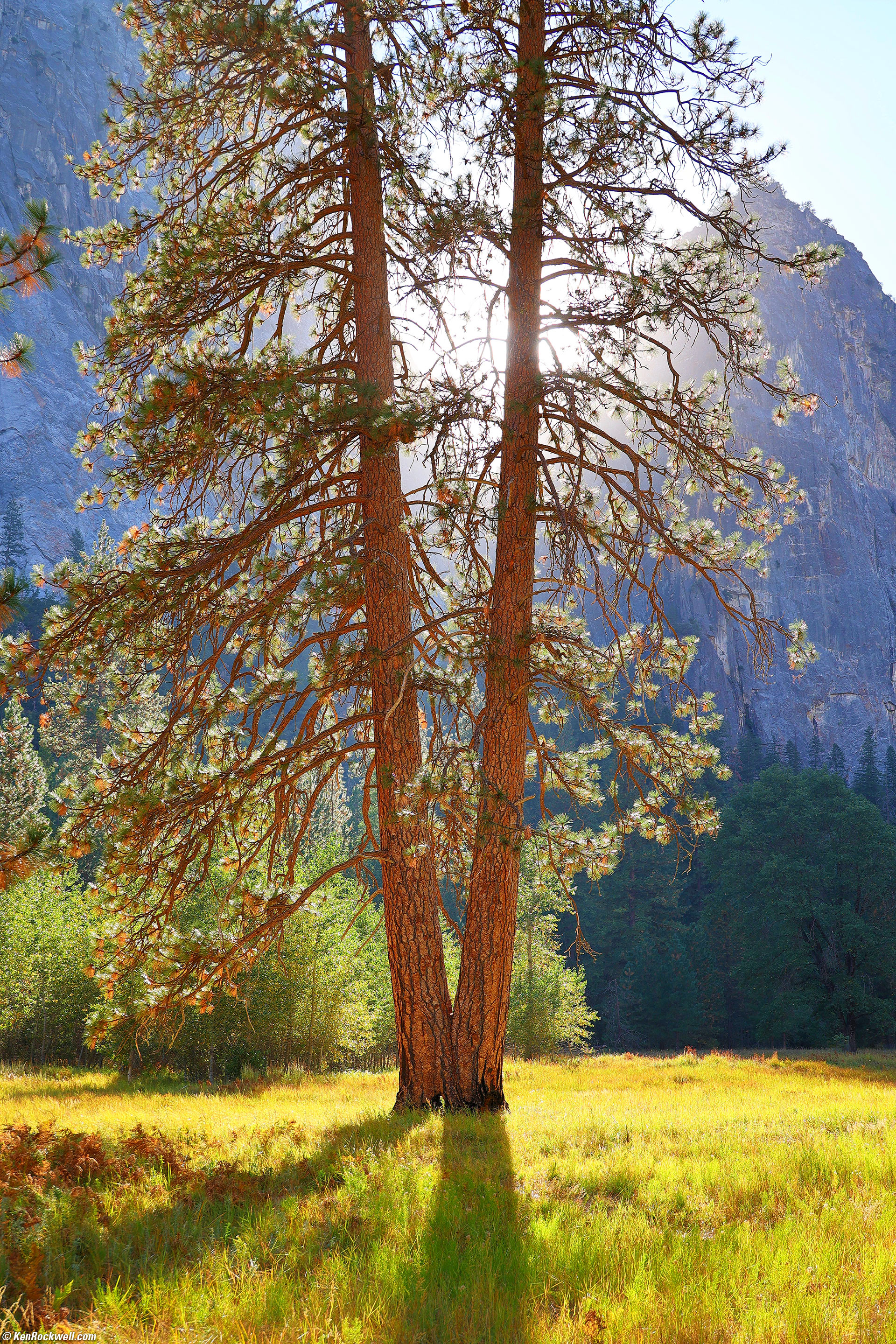 Backlit Tree Couple, El Capitan Meadow, Yosemite National Park, California, 3:45 P.M., 21 October 2022. Canon EOS R6, RF 24-240mm IS USM at 40mm, f/6.3 at 1/125 at Auto ISO 100 (LV 12.4). More tech details. bigger or fit-to-screen.