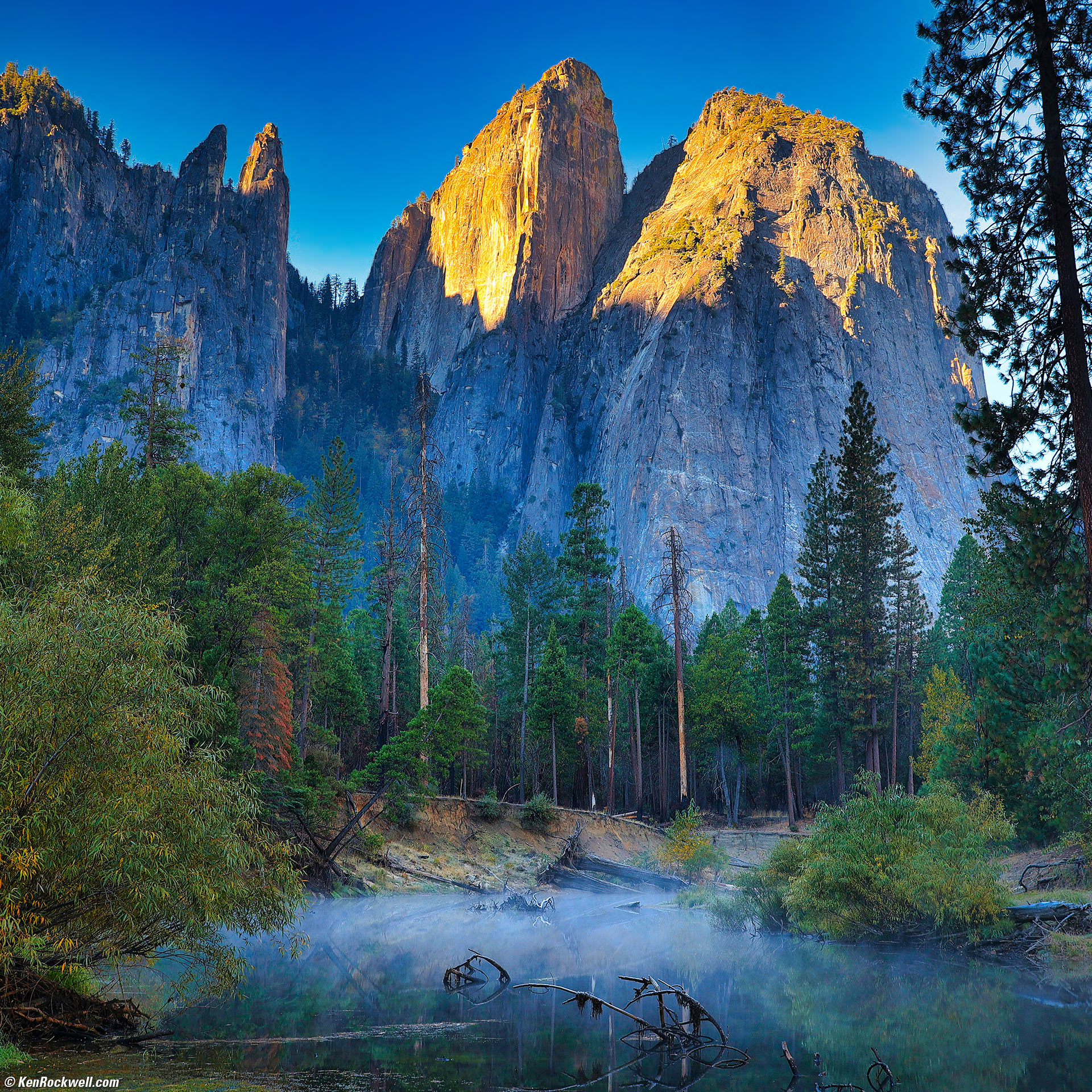 Cathedral Rocks and Merced River Fog at Dawn, Yosemite National Park, California, 8:34 A.M., 23 October 2022. Canon EOS R6 in square-crop mode, RF 24-240mm IS USM at 37mm (equivalent to the normal ZEISS 80mm f/2.8 PLANAR lens on HASSELBLAD 6×6), f/8 at 1/25 at Auto ISO 100, -1 stop exposure compensation (LV 10.6). More tech details. bigger or fit-to-screen.
